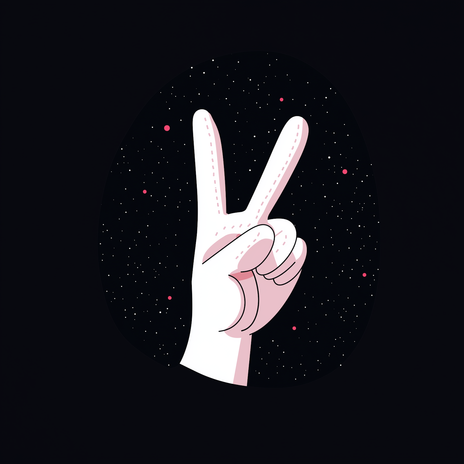 Cartoon hand making a peace sign against a starry night background, with pink accents and cosmic theme.
