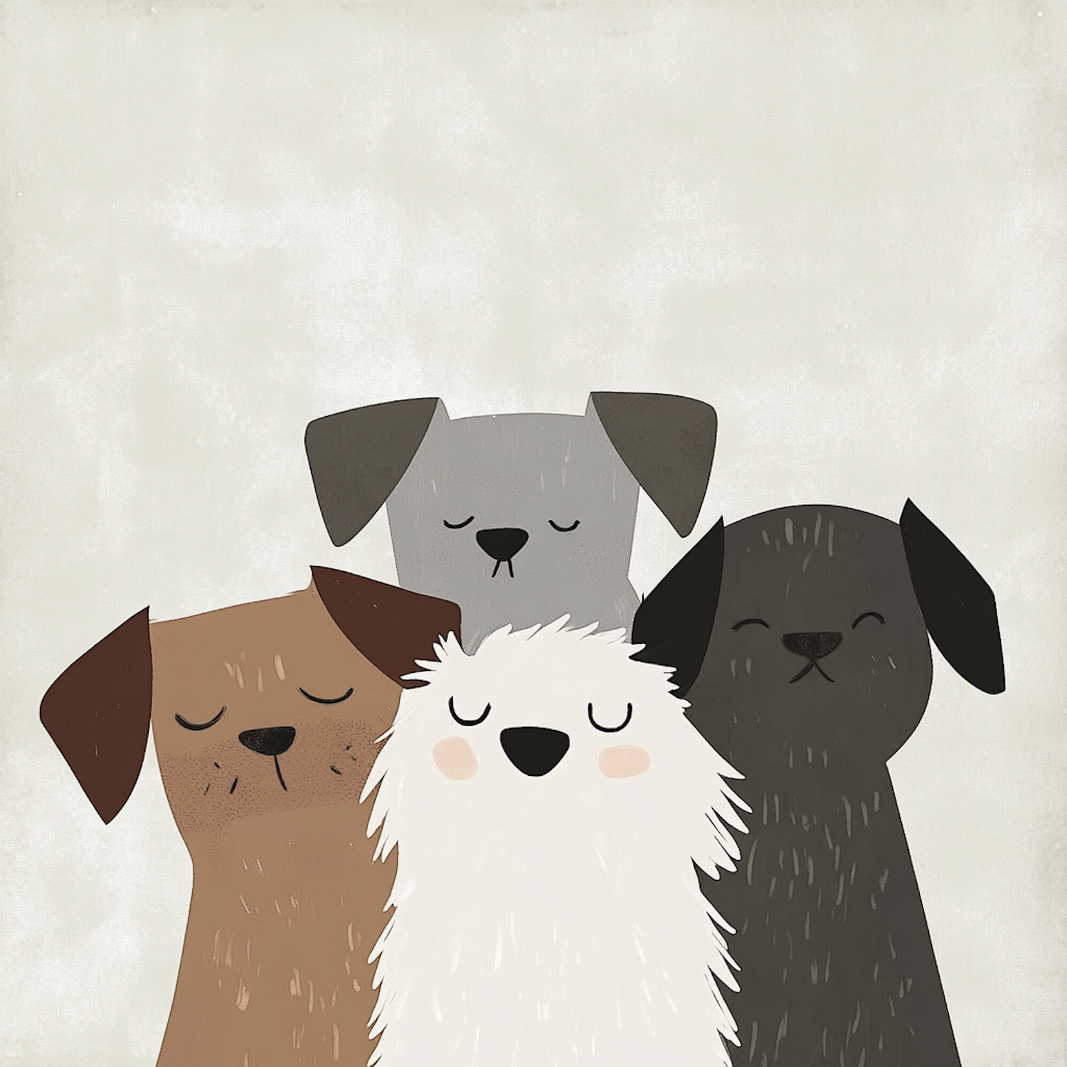 Cute cartoon illustration of four dogs in different colors with closed eyes, creating a peaceful and friendly vibe.