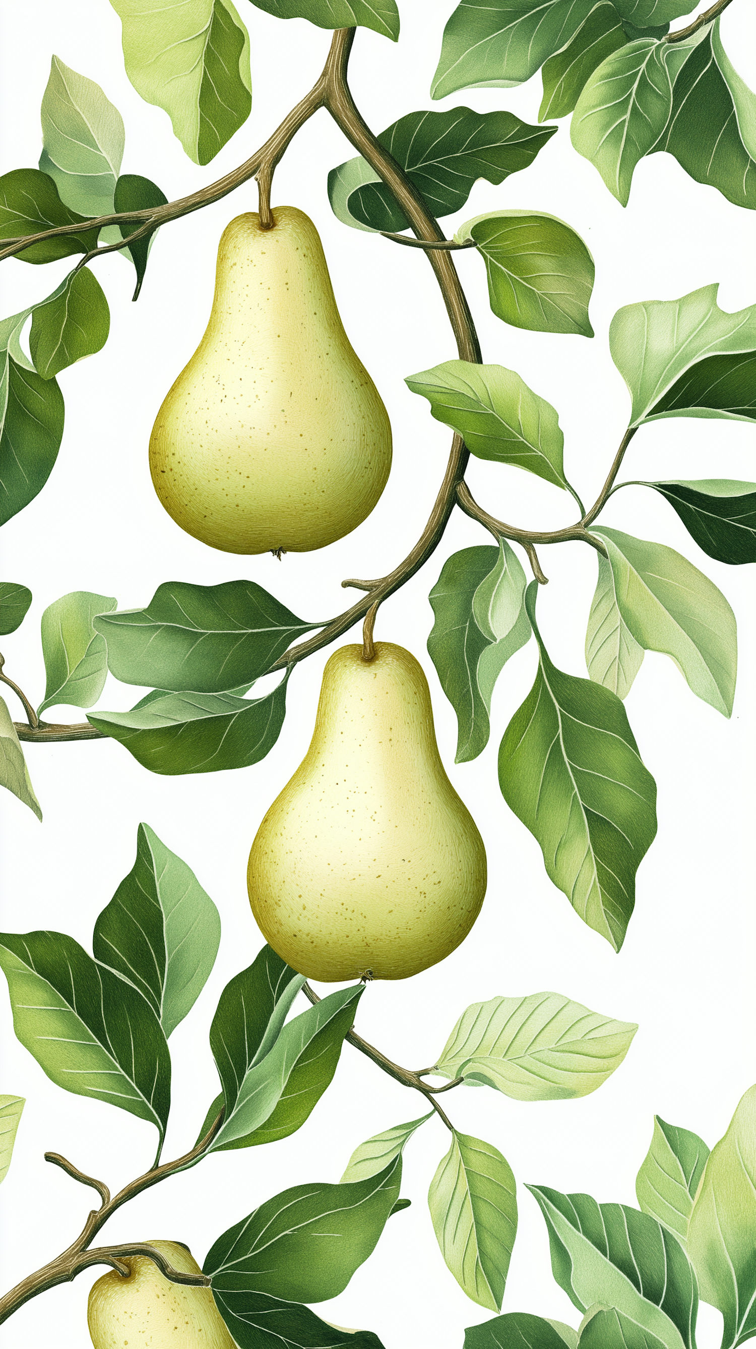 Illustration of ripe pears on branches with lush green leaves against a white background, showcasing nature's beauty.