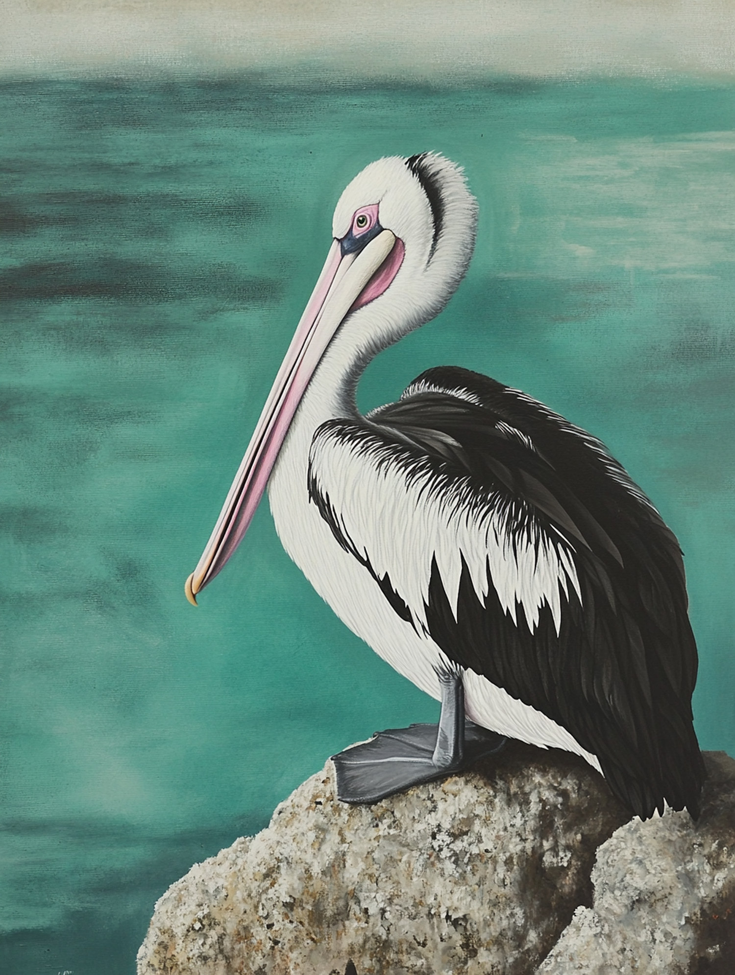 Illustration of a pelican with detailed plumage perched on a rock against a serene turquoise background.