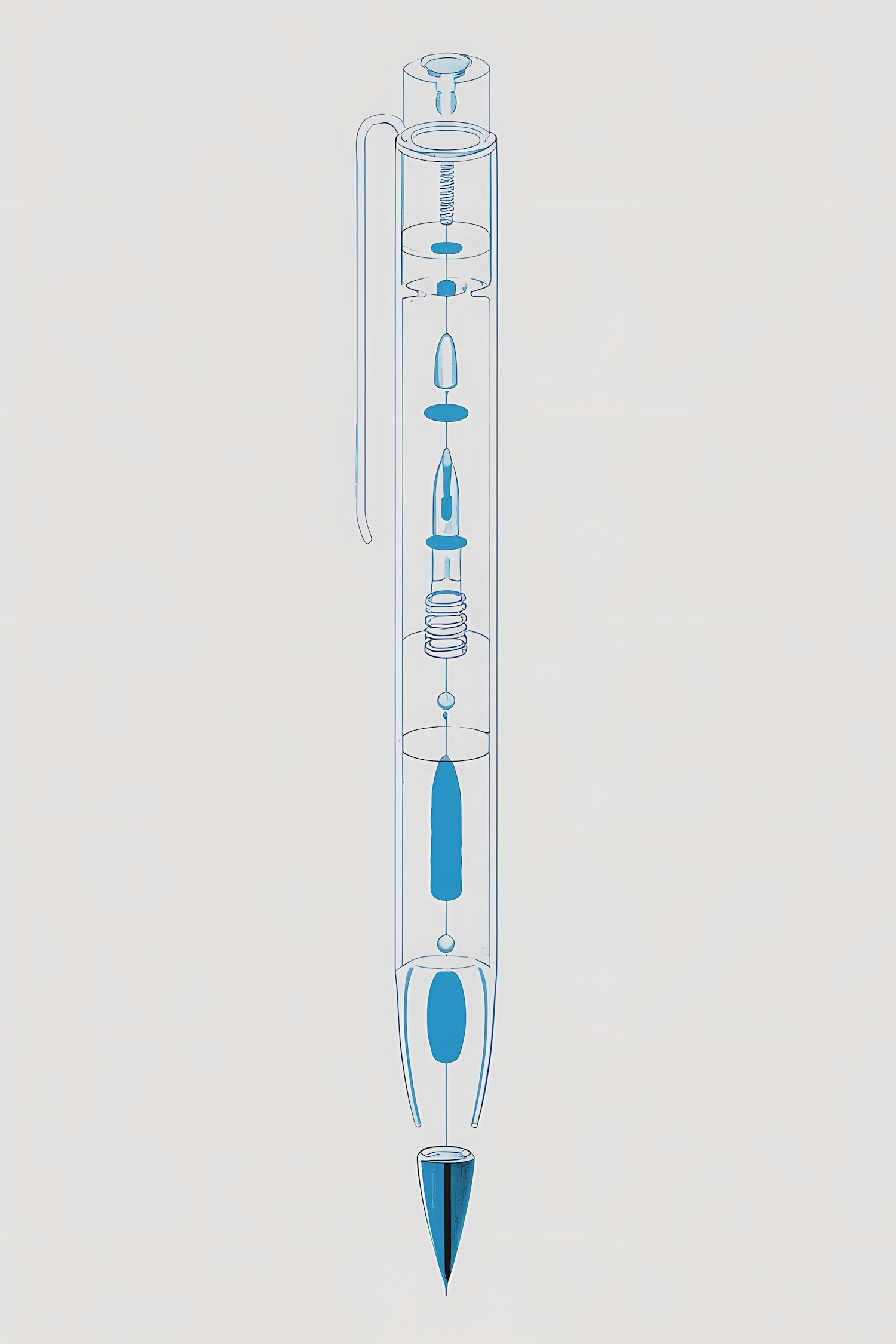 Transparent technical illustration of a pen's internal mechanism, highlighting components like the spring, ink reservoir, and tip.