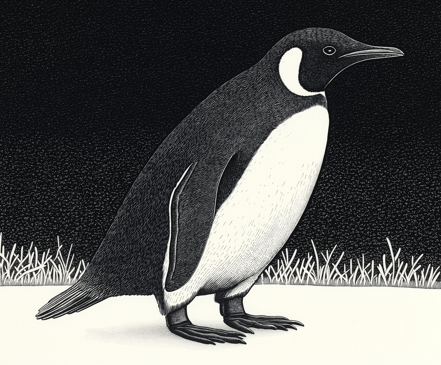 Intricate black-and-white illustration of a penguin on snow with a textured black sky and grass-like details at the base.