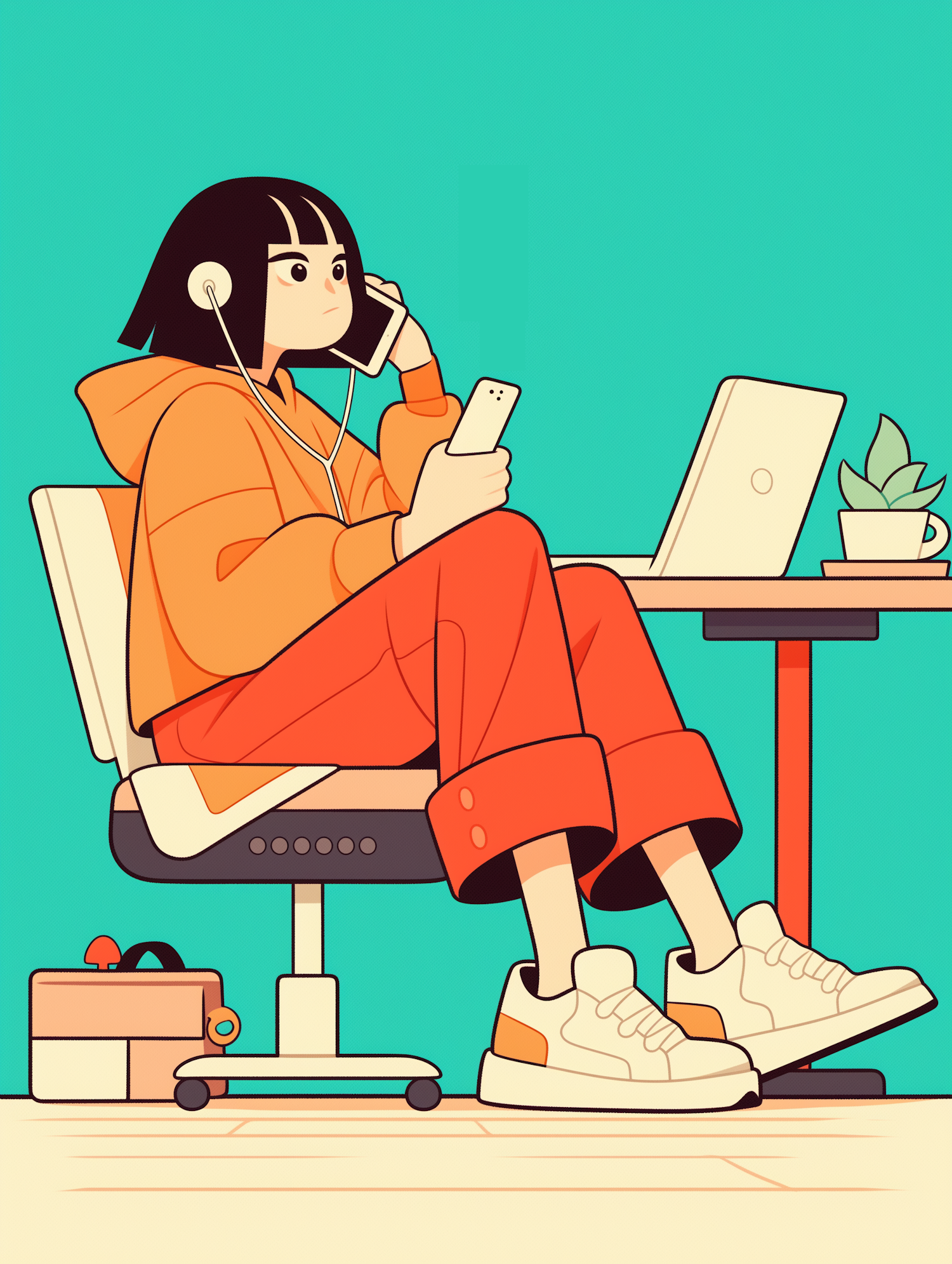 Stylized illustration of a young woman multitasking in a modern workspace with a laptop, smartphone, and headphones.