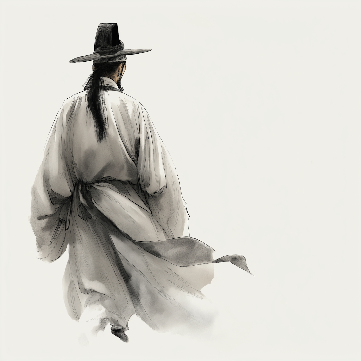 Elegant illustration of a figure in traditional Korean hanbok and gat, with flowing robes and a serene minimalist style.