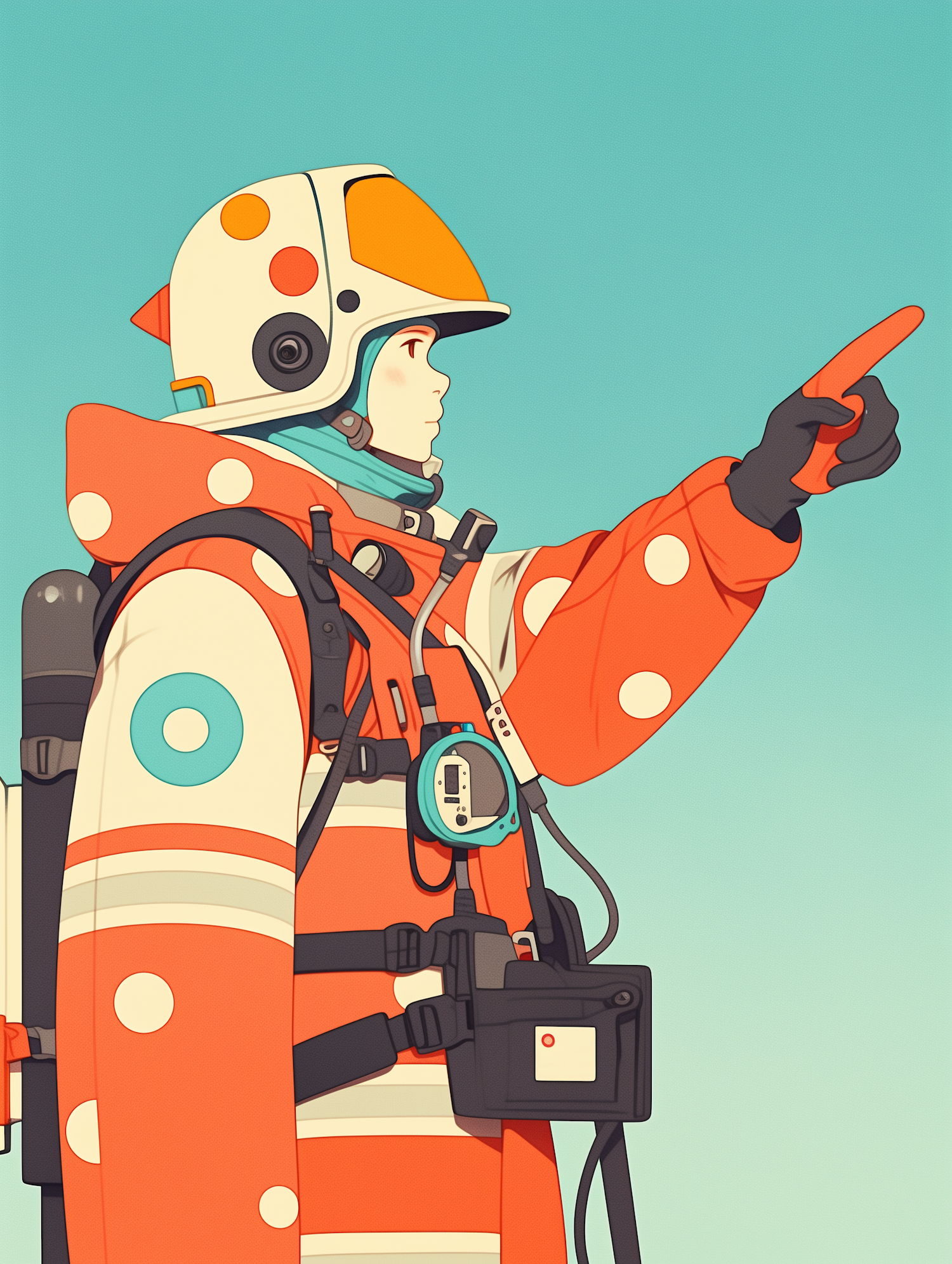 Stylized astronaut in an orange polka-dot suit pointing forward, set against a clear blue sky. Modern and playful design.