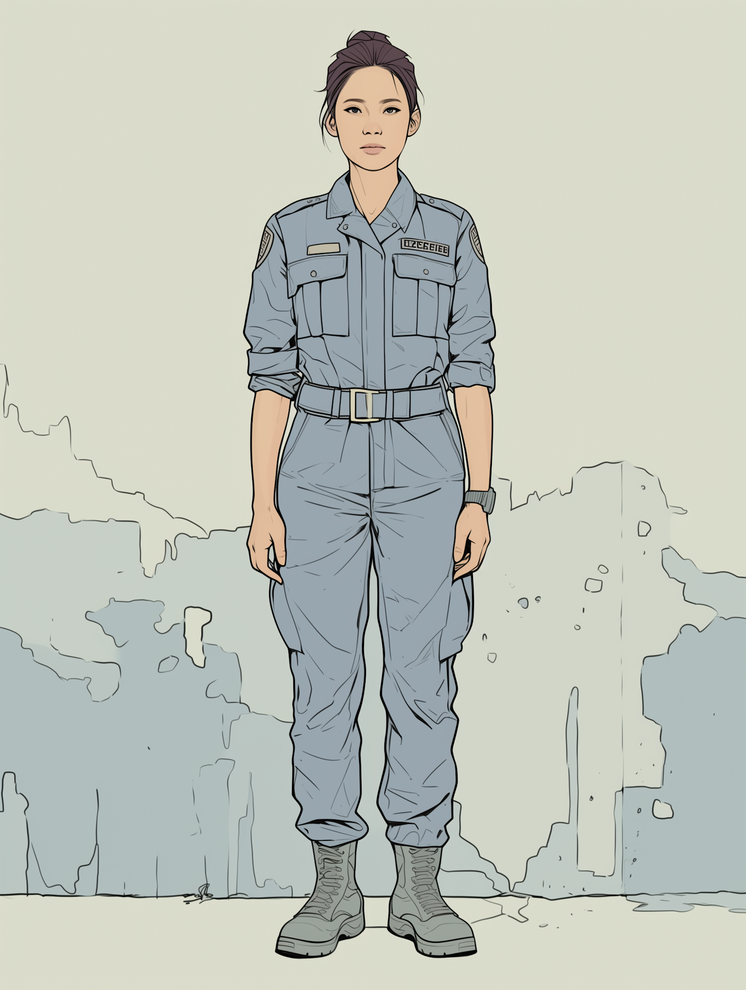 Illustration of an Asian woman in a military uniform, standing confidently with a focused expression against a muted background.