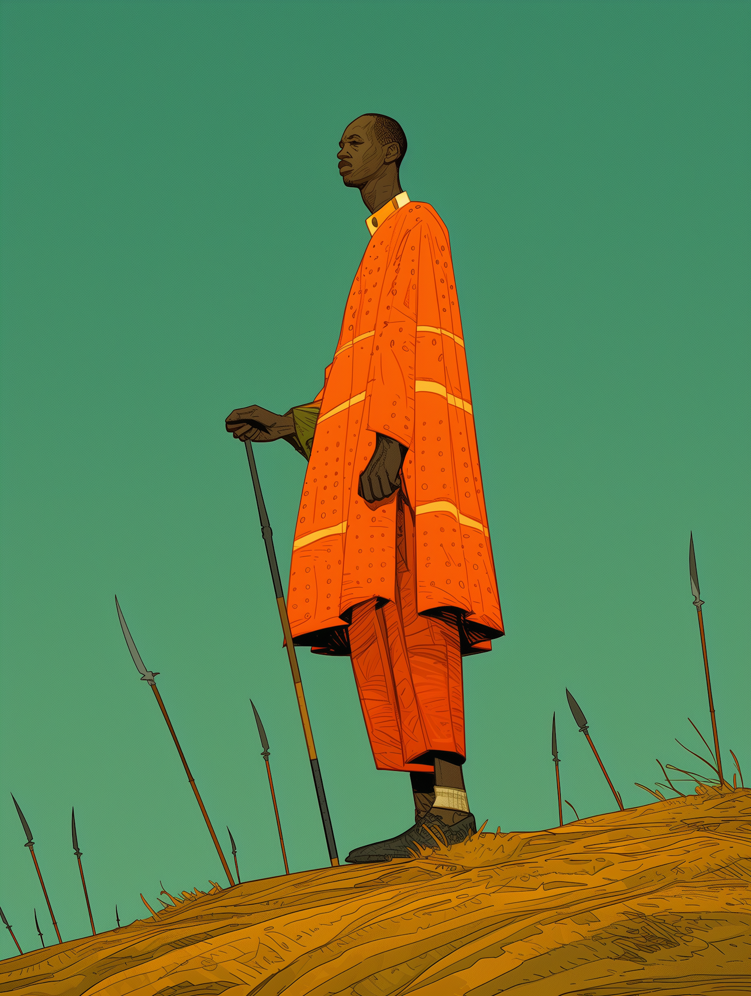 A man in a vibrant orange robe stands on a hill with spears, holding a staff against a green backdrop, exuding strength and dignity.