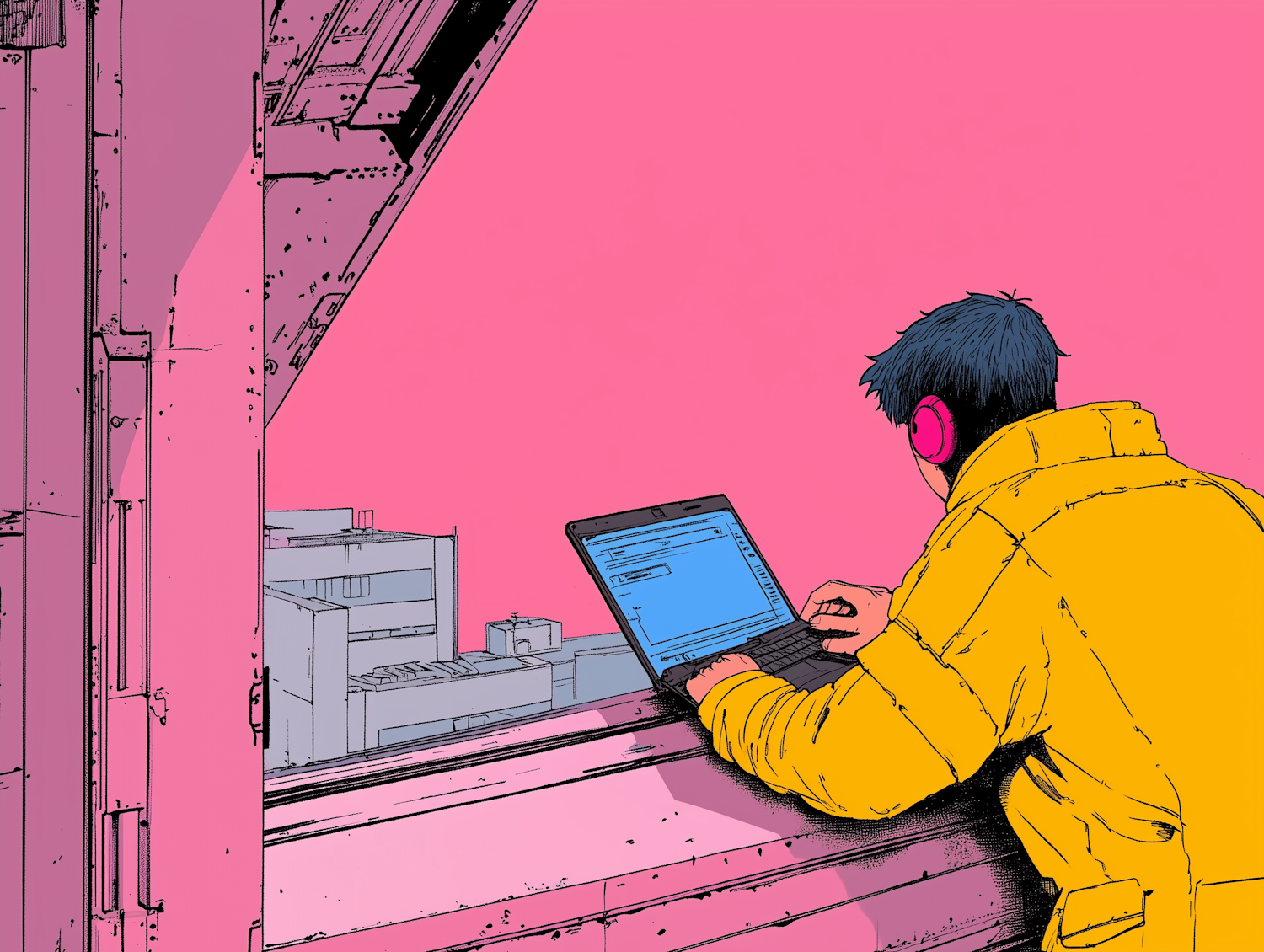 Asian man in yellow jacket with pink headphones using laptop by window, vibrant pink background, urban setting.