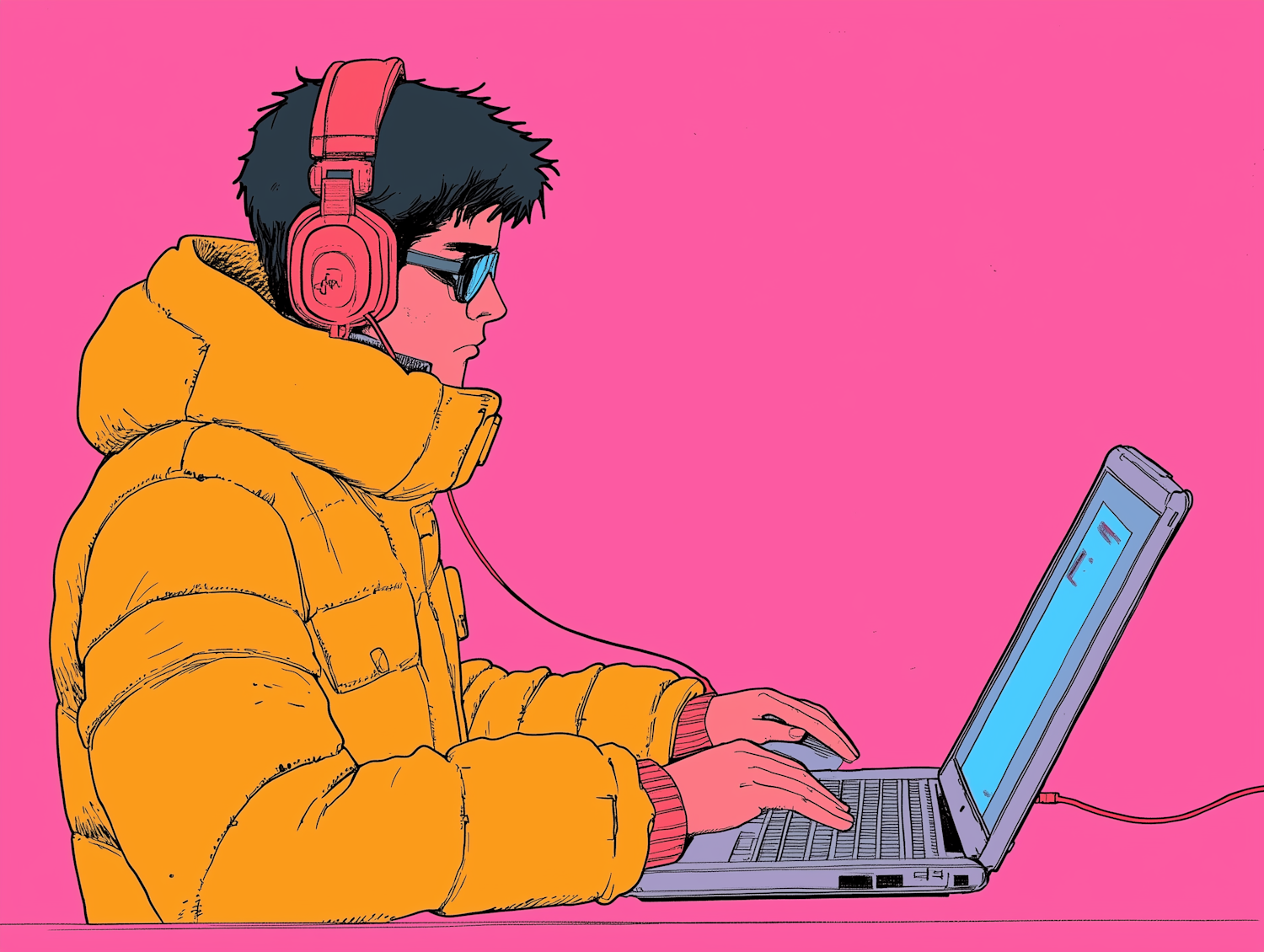 Illustration of a person in an orange jacket and red headphones using a laptop against a bright pink background.