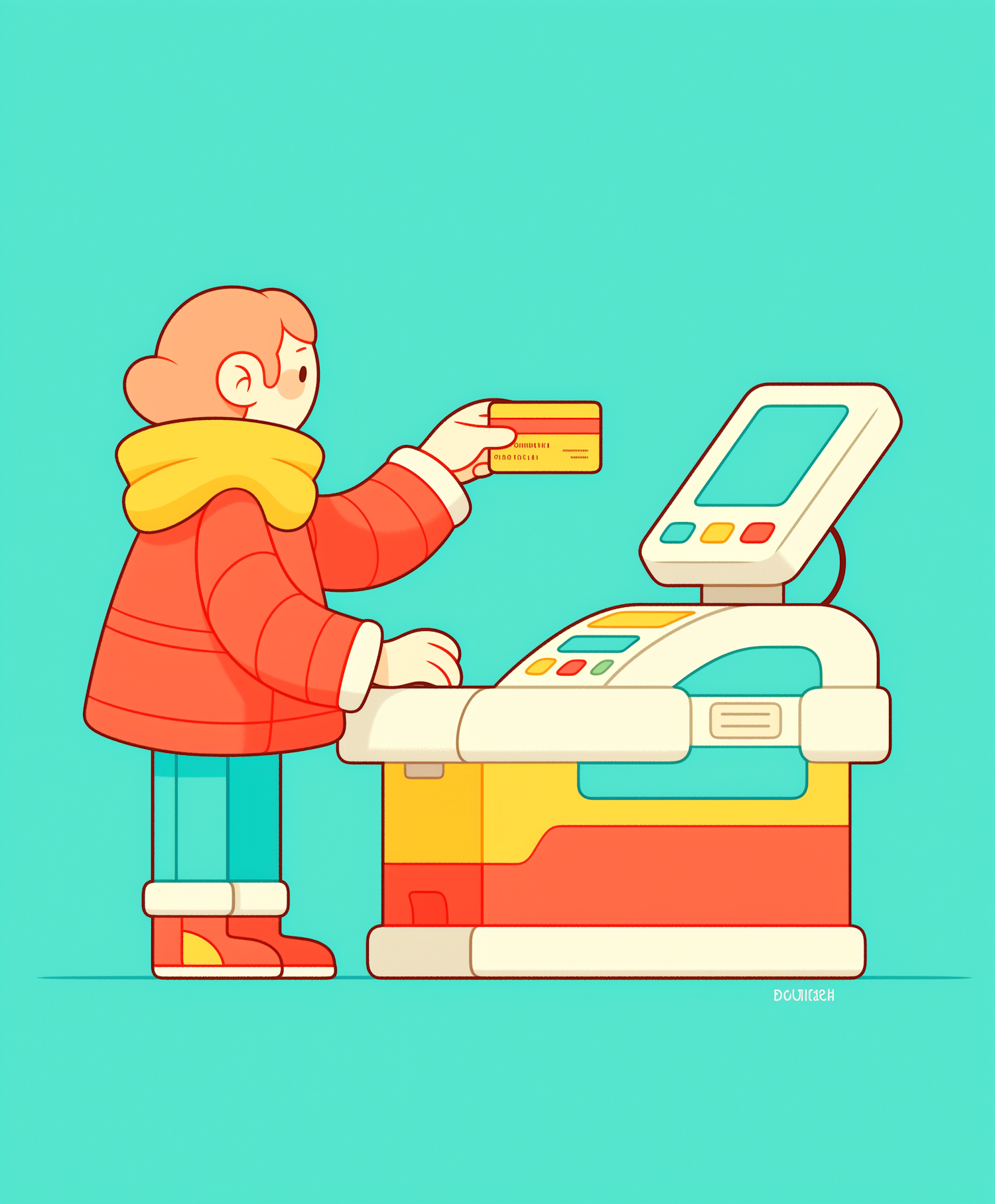 Cartoon illustration of a person using a credit card at a checkout counter with a modern card reader.
