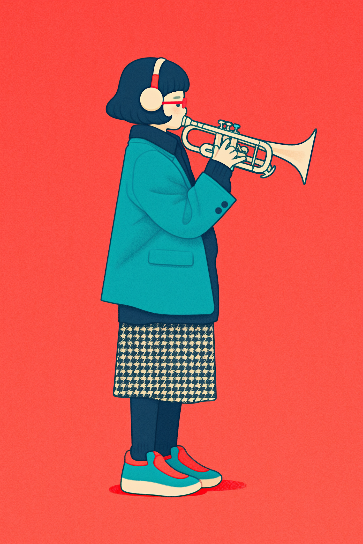 Stylized illustration of a person playing a trumpet, wearing teal and red attire, set against a vibrant red background.