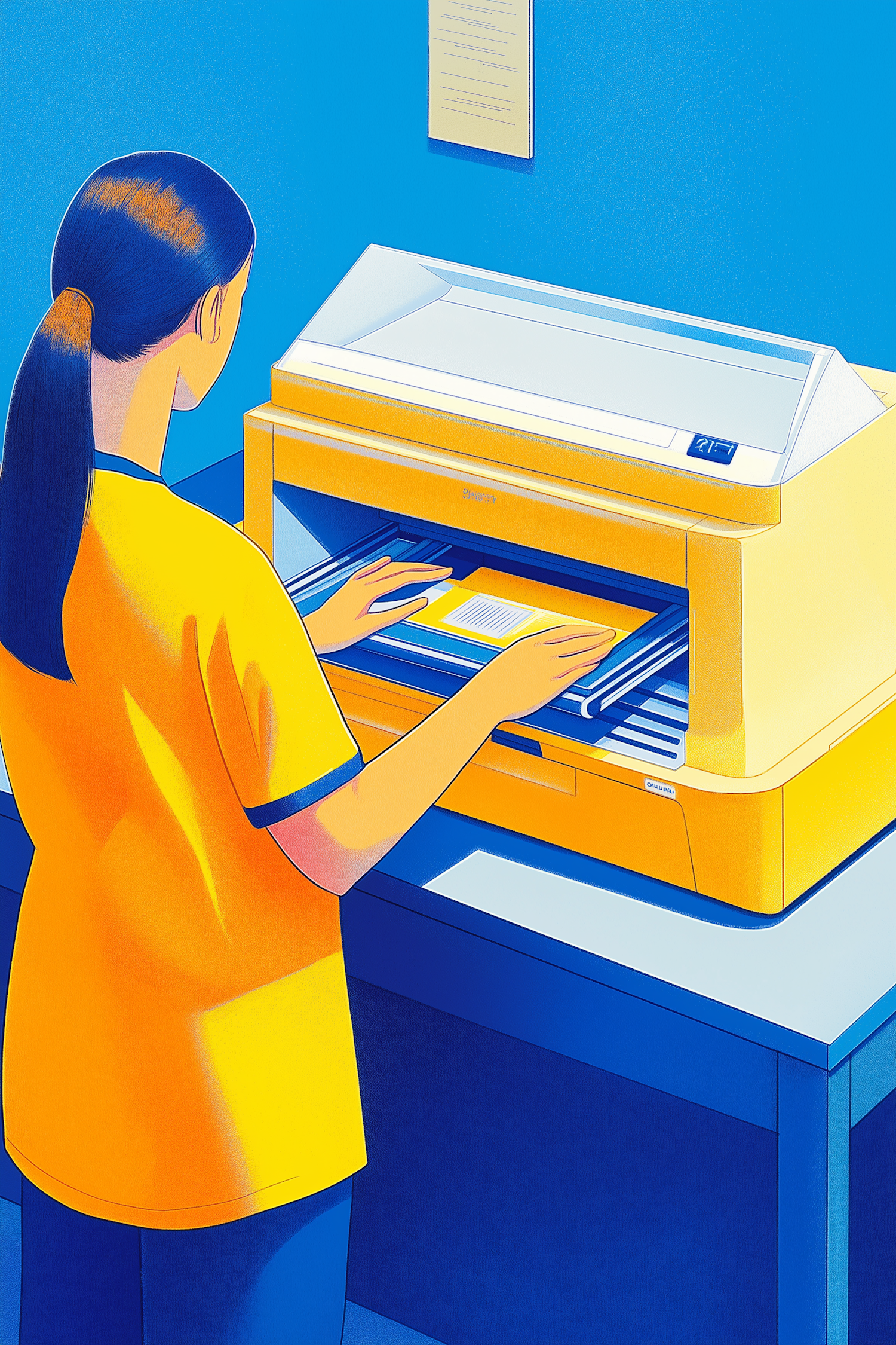 Asian woman in yellow shirt using a large yellow printer against a blue background. Vibrant colors and sleek design create a striking scene.
