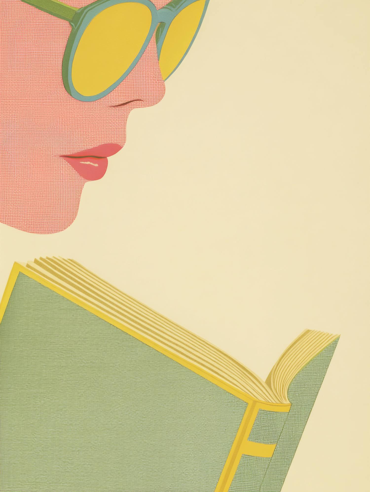 Minimalist illustration of a person with green sunglasses reading a green book with yellow accents on a soft beige background.