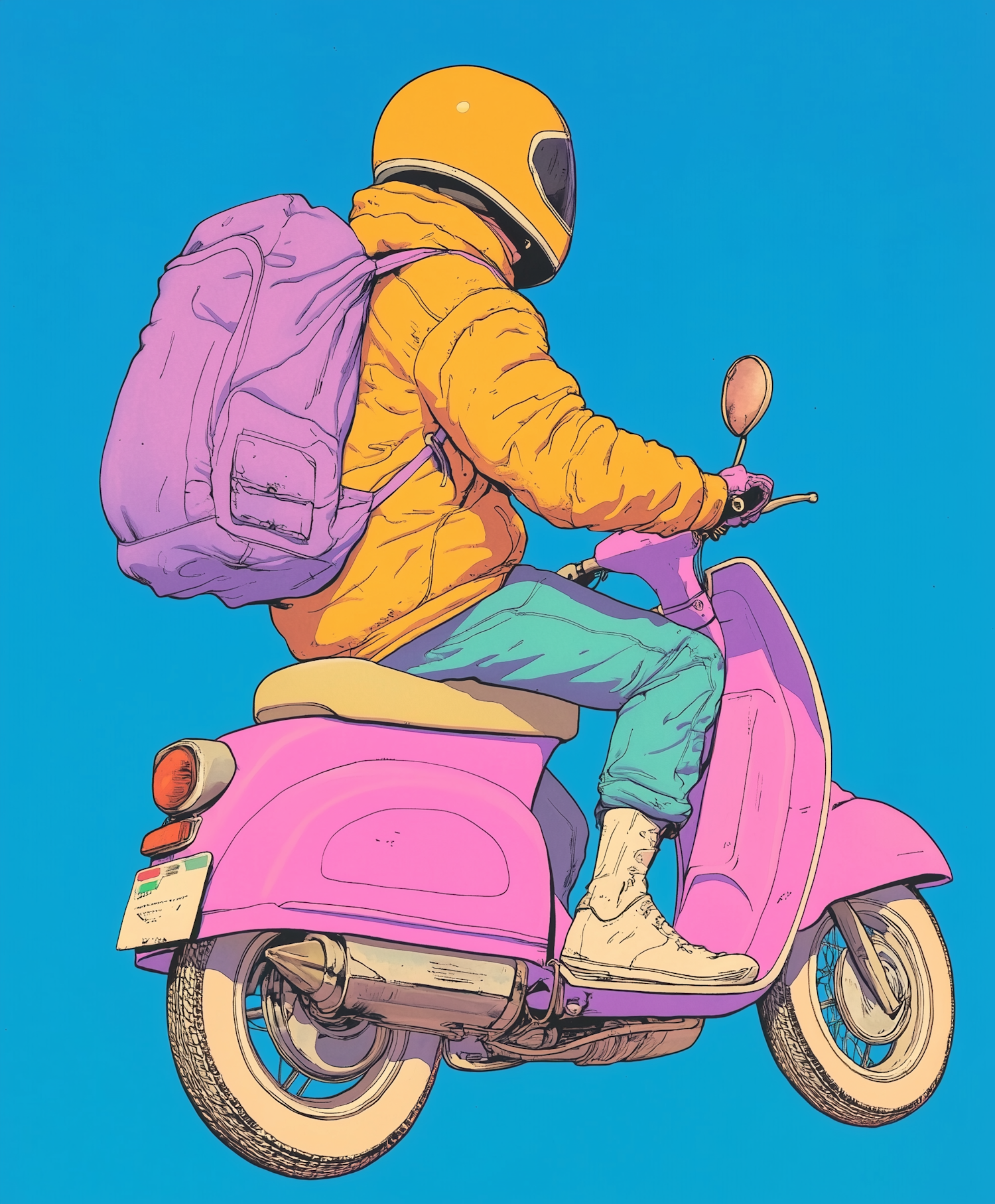 Colorful illustration of a person on a pink scooter with a yellow helmet and purple backpack against a bright blue background.