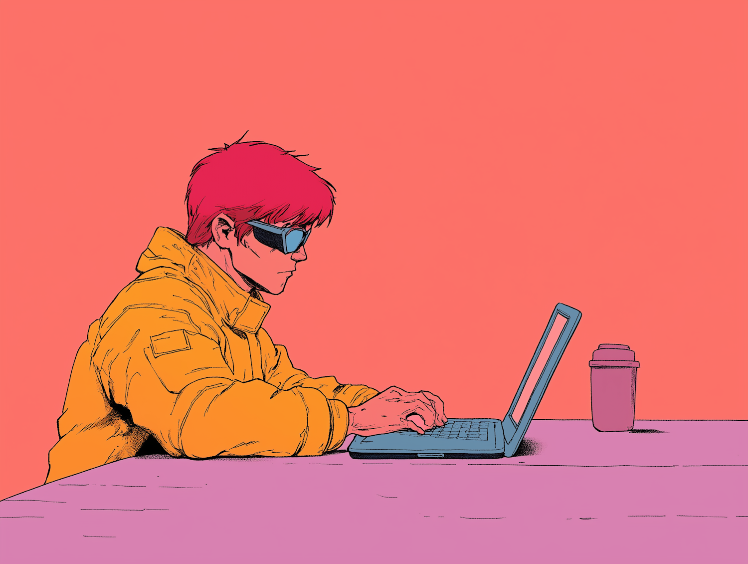 Stylized illustration of a person with red hair and sunglasses typing on a laptop, set against a coral background with a coffee cup nearby.