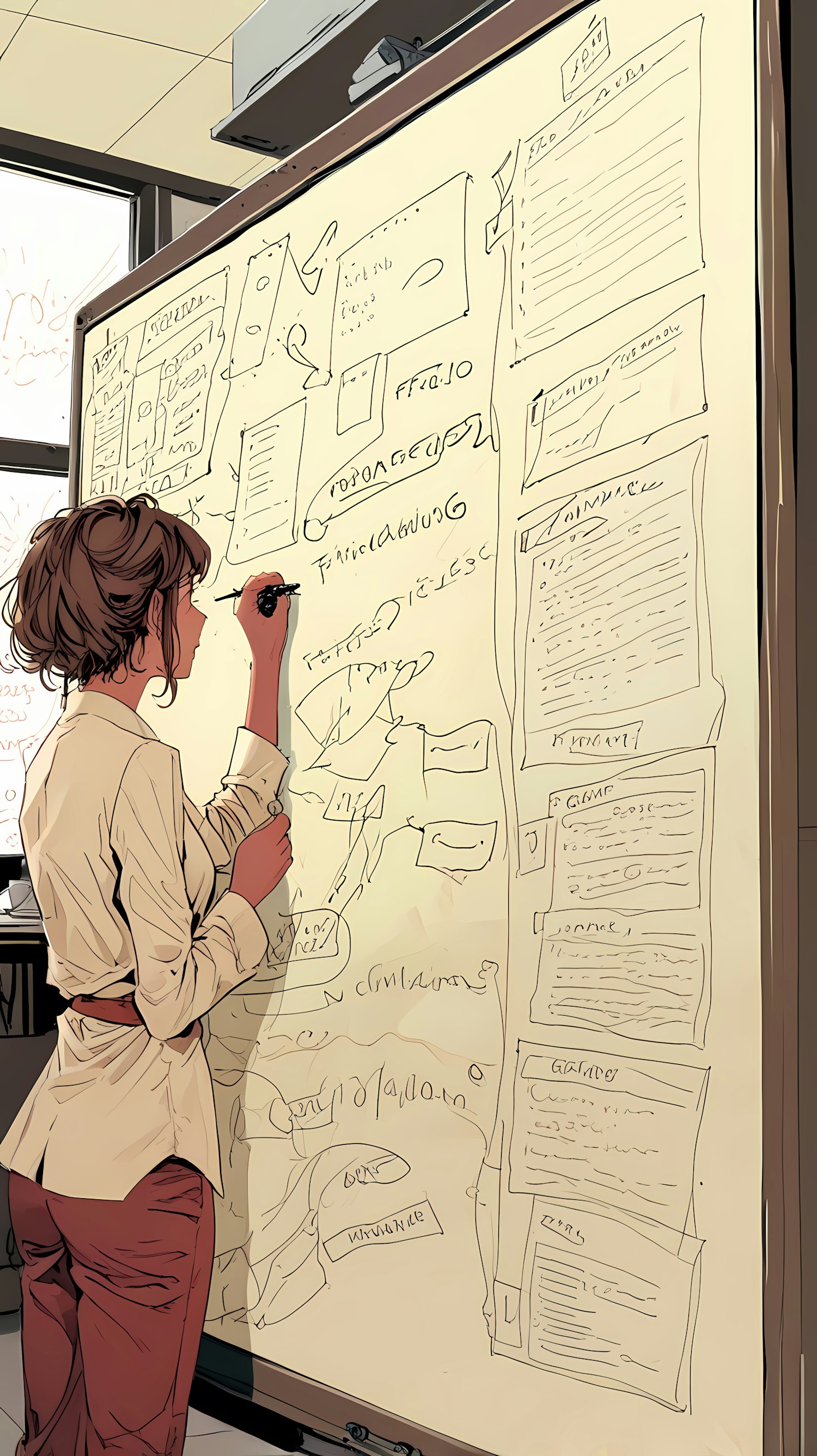 An individual writing on a large whiteboard filled with complex sketches and notes, captured in detailed artistic style.