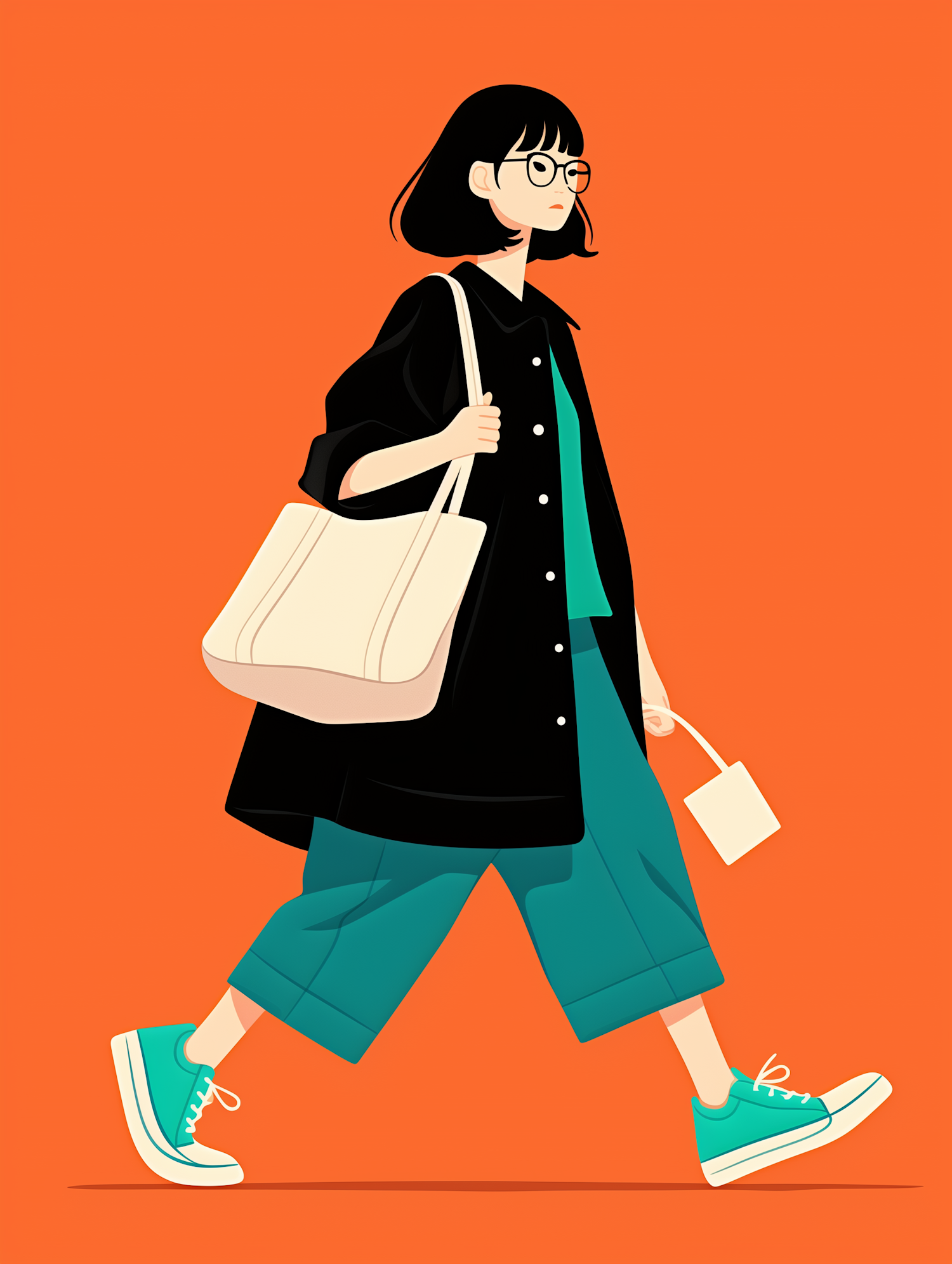 Illustration of a stylish woman walking with a tote bag, wearing teal pants and sneakers, against a vibrant orange background.