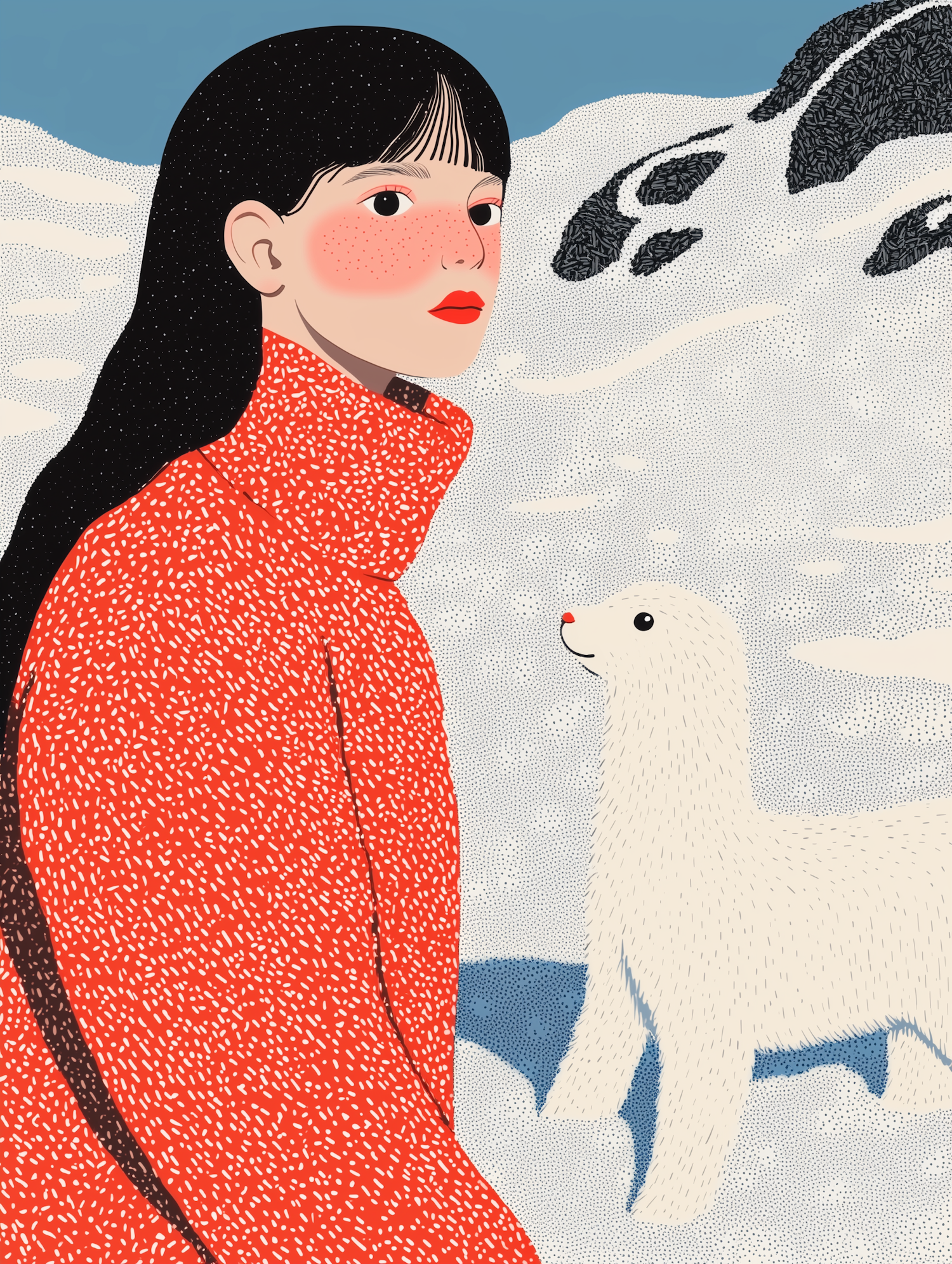 Stylized illustration of a woman in a red coat with a white arctic animal in a snowy landscape under a clear blue sky.