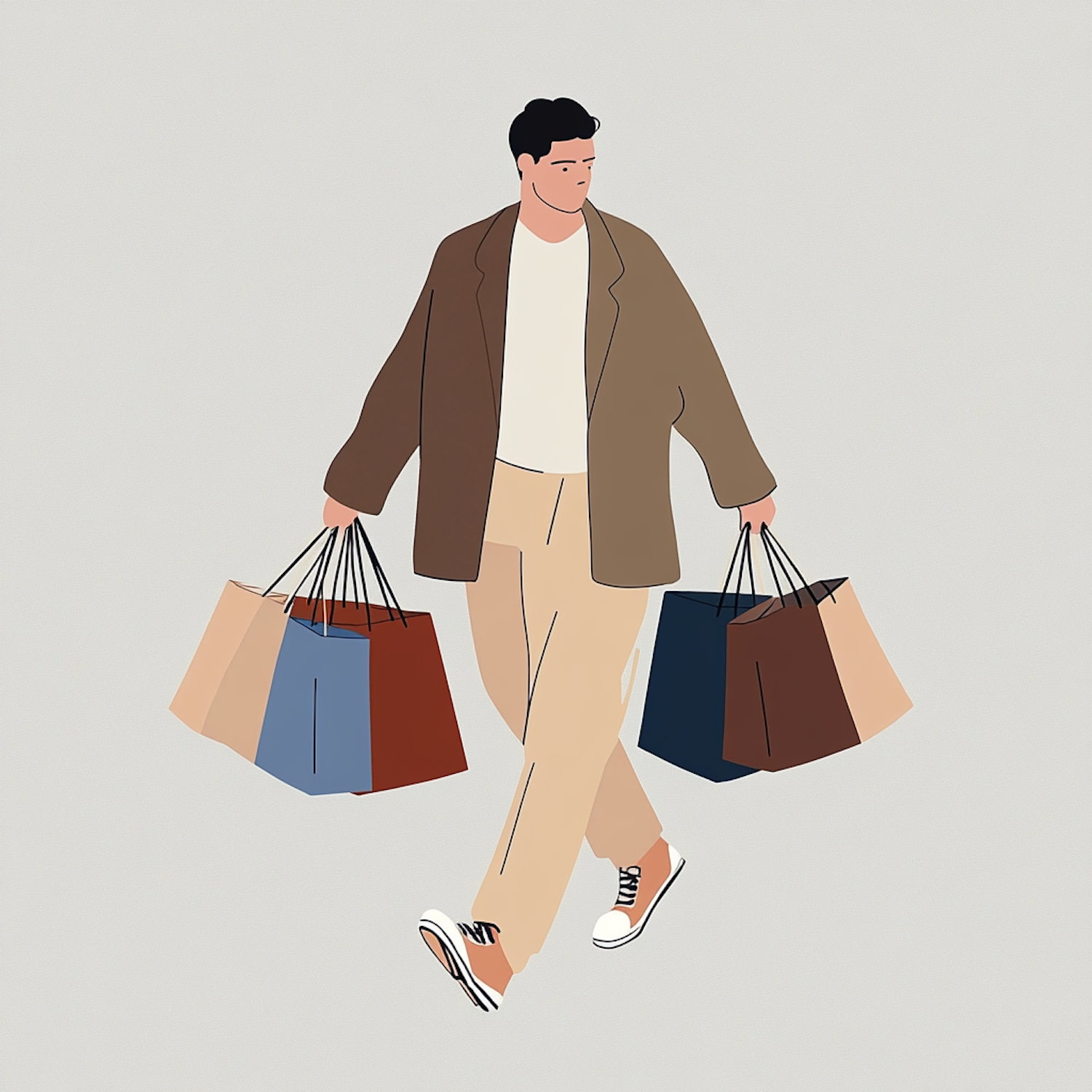 Minimalist illustration of a man carrying colorful shopping bags, dressed in a casual brown jacket, beige pants, and white sneakers.