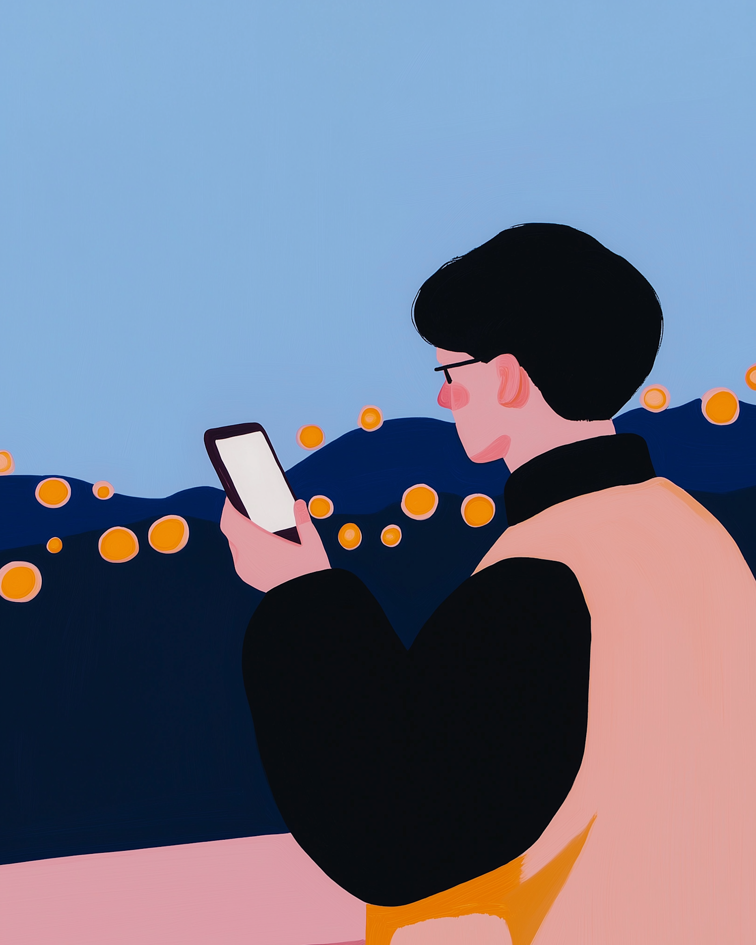 Stylized illustration of a person with a smartphone against a dreamy blue and orange bokeh background.