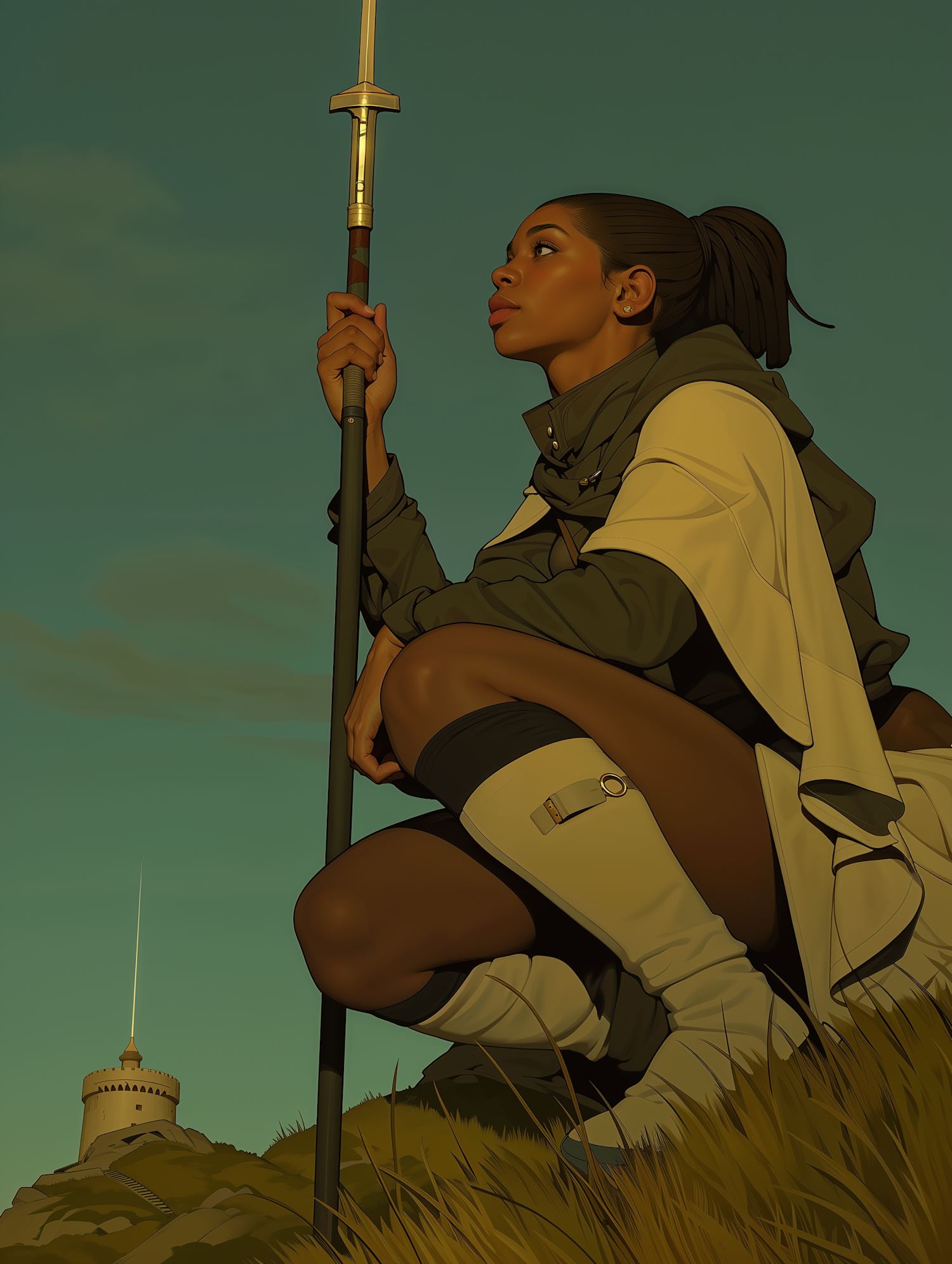 A woman in a white cape and boots holds a spear on a hill, with a tower in the background, evoking a sense of adventure.