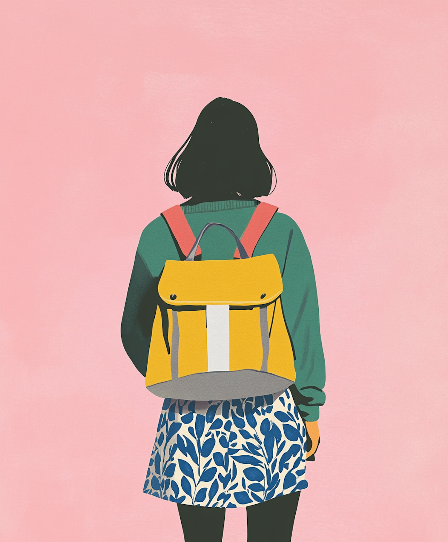 Stylized illustration of a person with a yellow backpack against a pastel pink background, wearing a green sweater and patterned skirt.