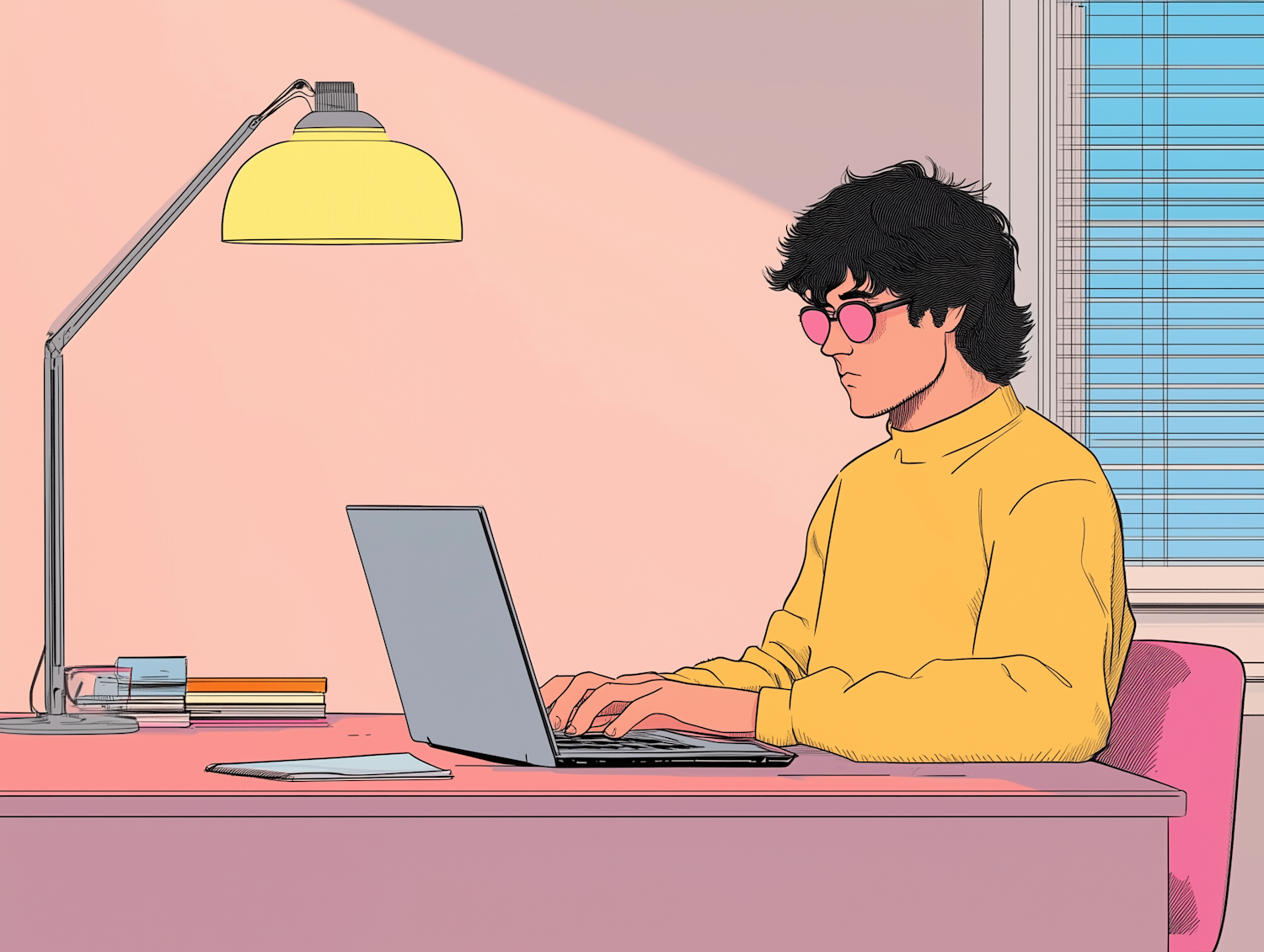 Young man in yellow sweater and pink glasses working on a laptop at a pink desk, with a modern lamp and window blinds in the background.