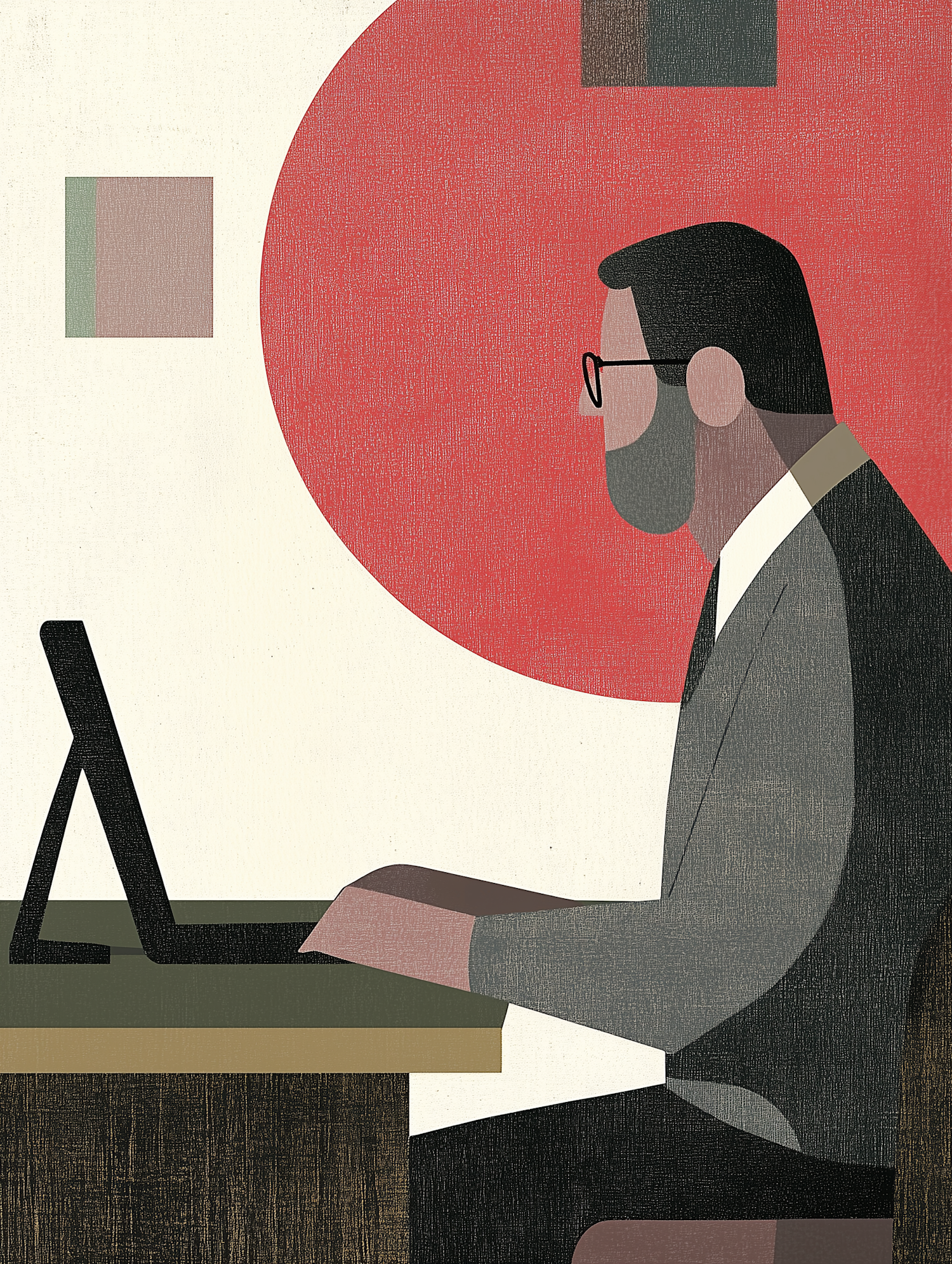 Abstract illustration of a person with a beard and glasses working on a laptop, set against a modern geometric background.
