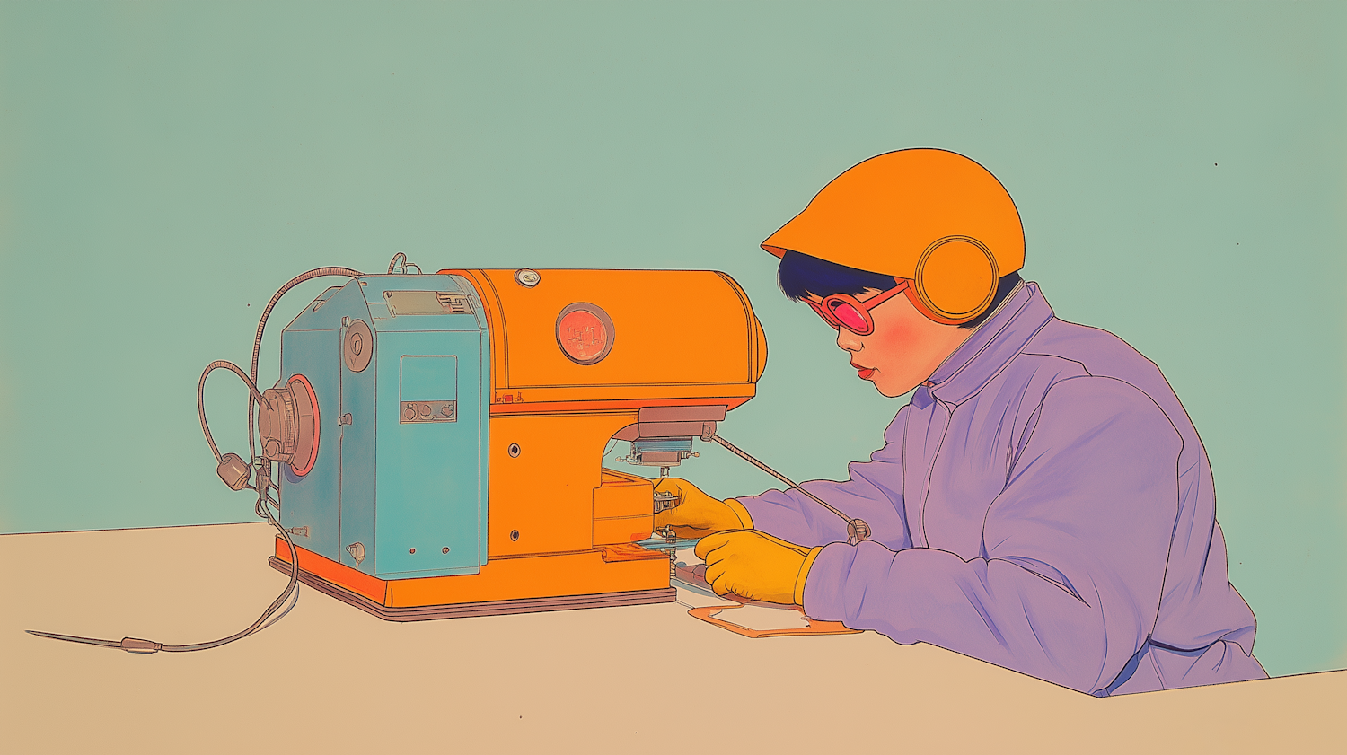 Illustration of a person in protective gear operating a colorful machine, set against a teal background, highlighting industrial precision.