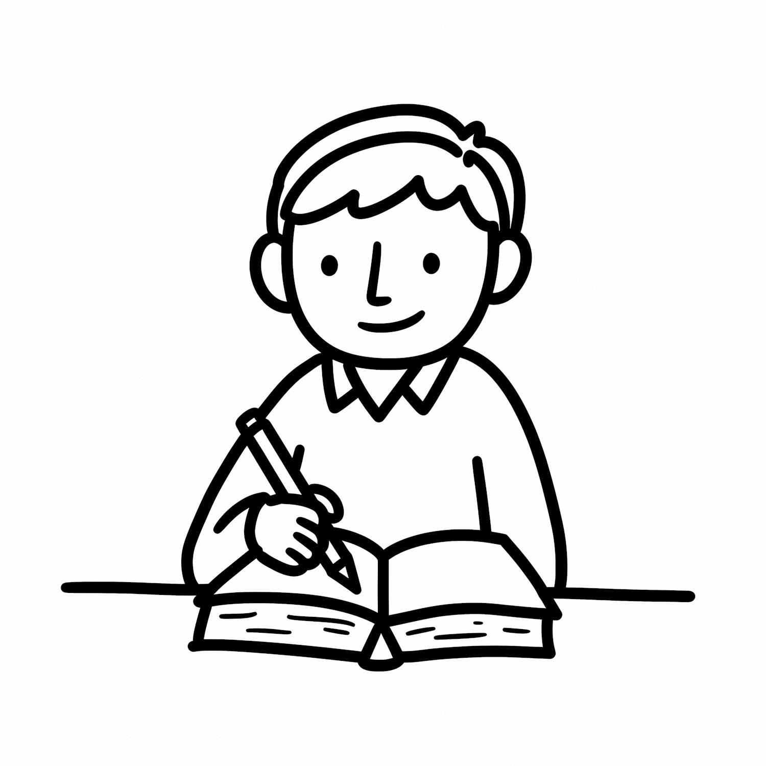A simple black-and-white line drawing of a person writing in a book, perfect for educational or creative themes.