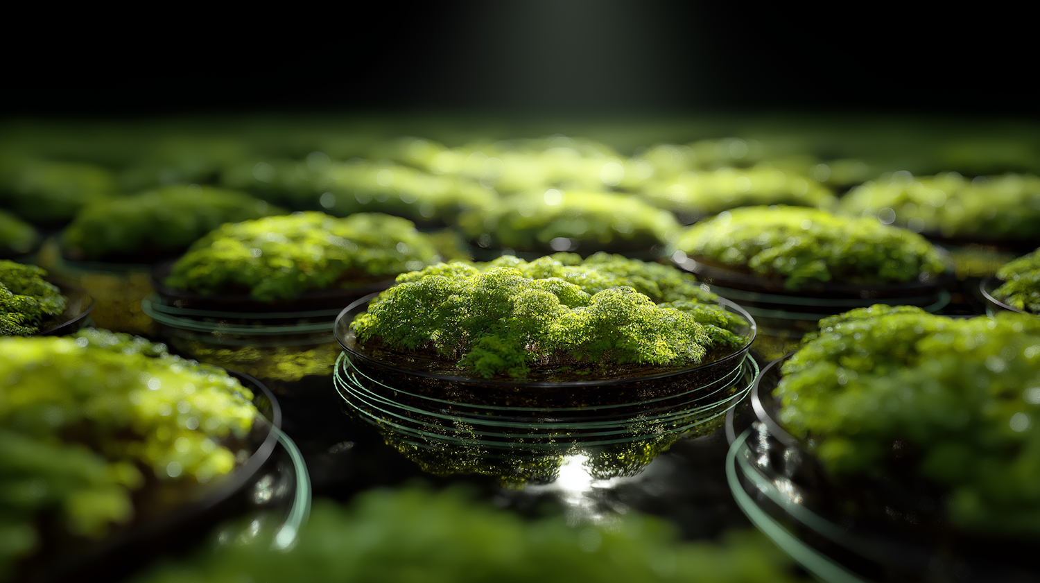 Close-up of vibrant green moss-like plants in petri dishes, arranged on a reflective surface with soft lighting and a dark background.