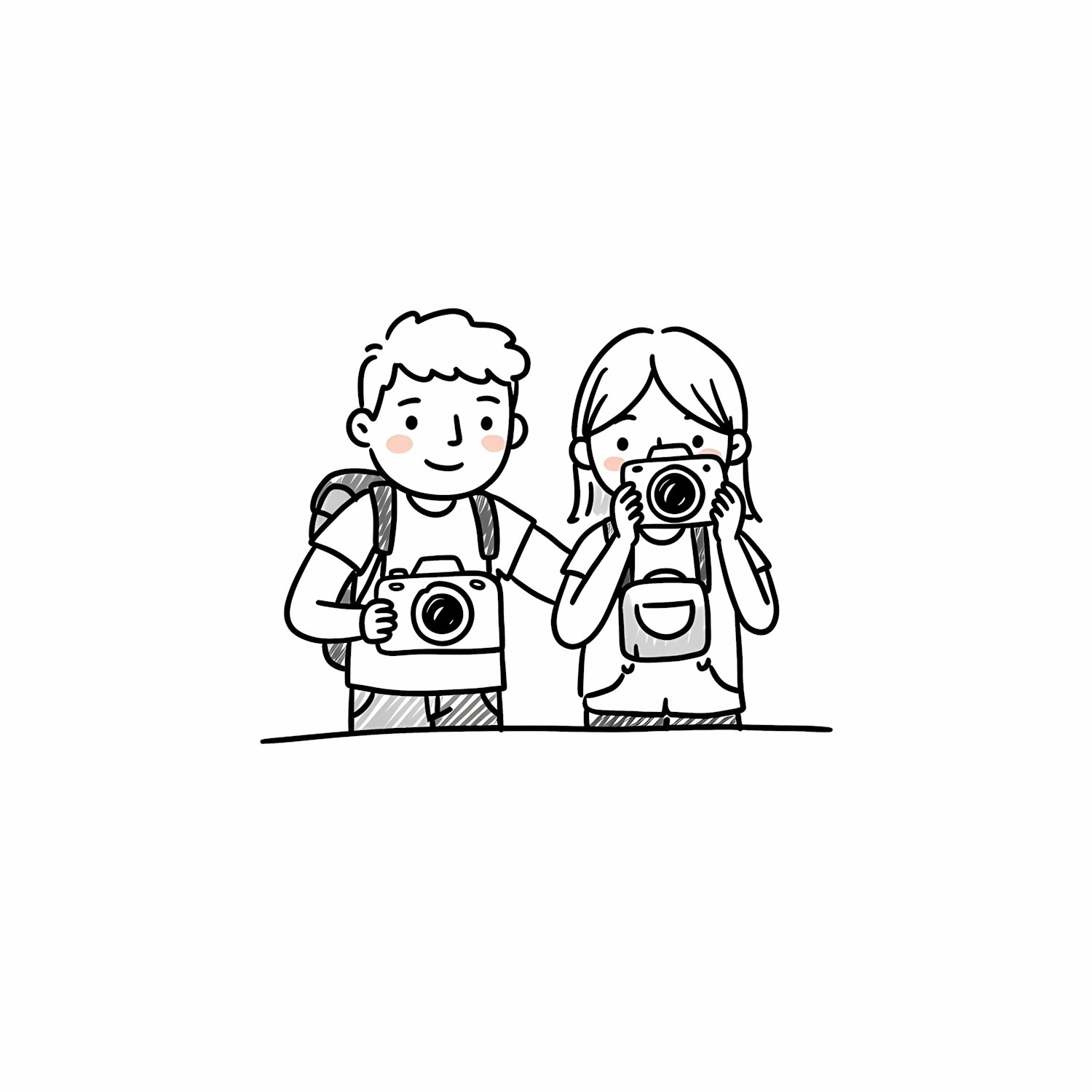Cute illustration of two kids with cameras, one taking a photo, perfect for themes of adventure, photography, or creativity.