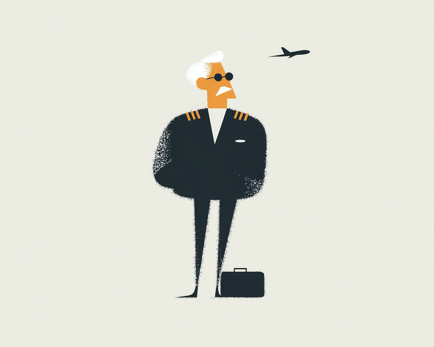Minimalist illustration of a pilot in uniform with a briefcase and an airplane in the background, showcasing a clean and modern design.