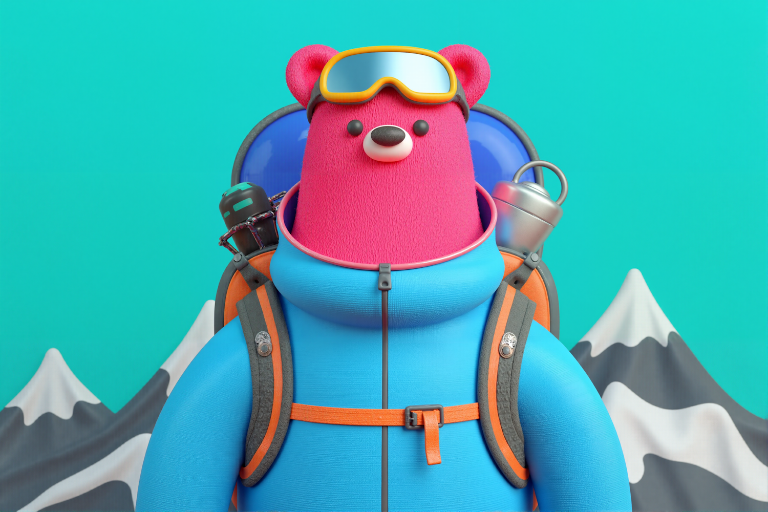 A cute pink bear in hiking gear, ready for adventure! Bright colors and a fun mountain backdrop make this 3D illustration pop.