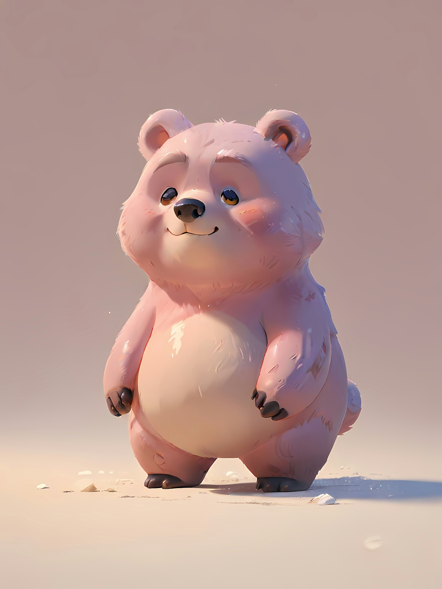 Adorable 3D pink bear with fluffy fur and a cheerful expression, standing on a sandy surface with a soft gradient background.