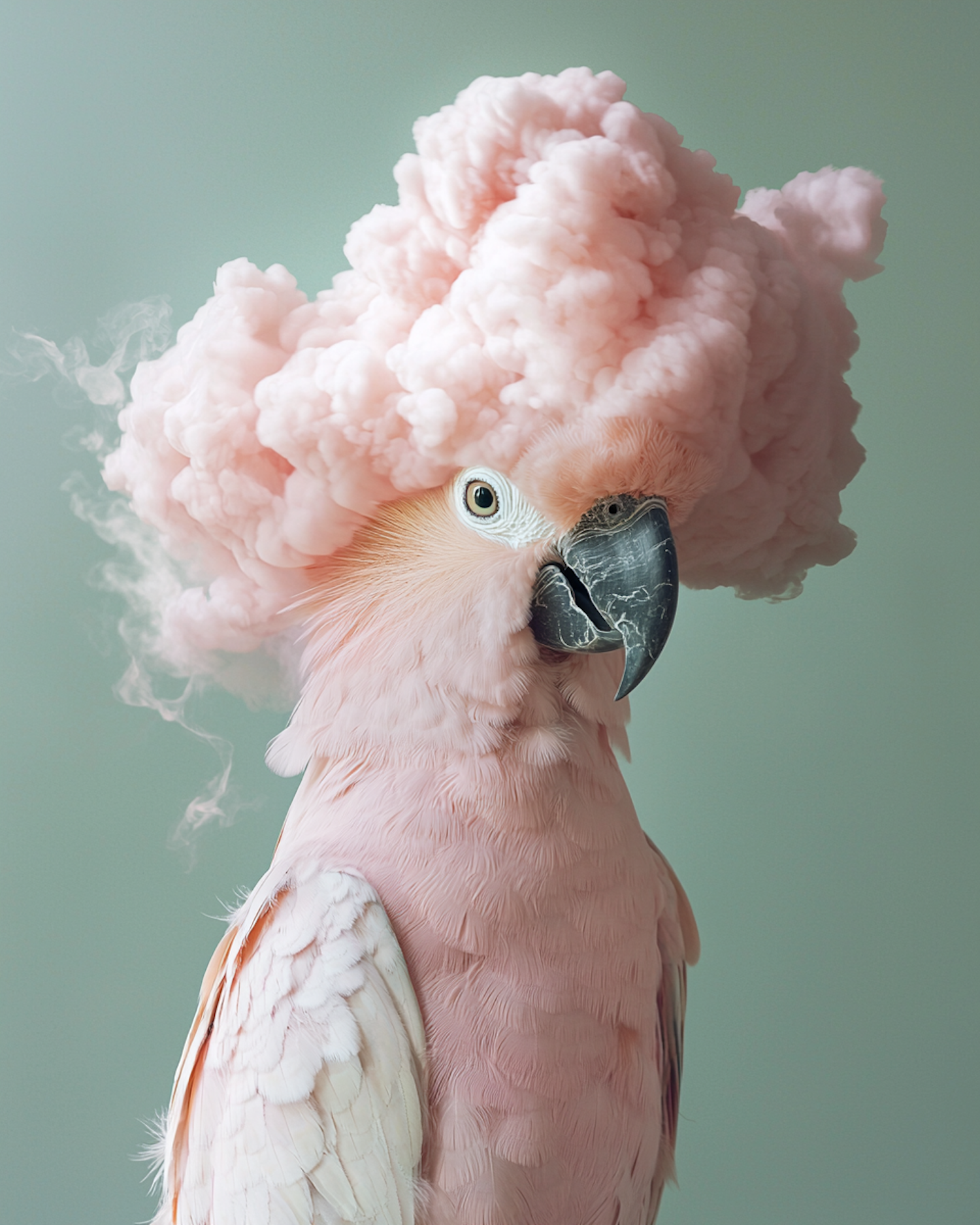 A pink cockatoo with a fluffy, cloud-like crest in soft pink, set against a muted green background. Whimsical and surreal art.