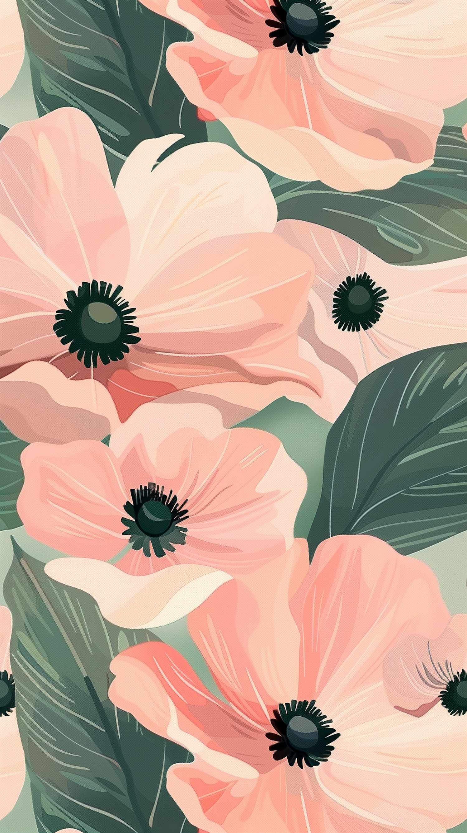Beautiful illustration of soft pink flowers with dark green centers and lush leaves, creating a serene and artistic floral design.