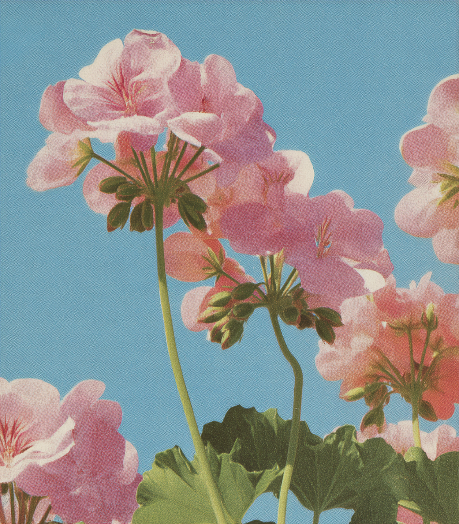Vivid pink geranium flowers against a clear blue sky, delivering a perfect balance of color and textures. A summer's dream!