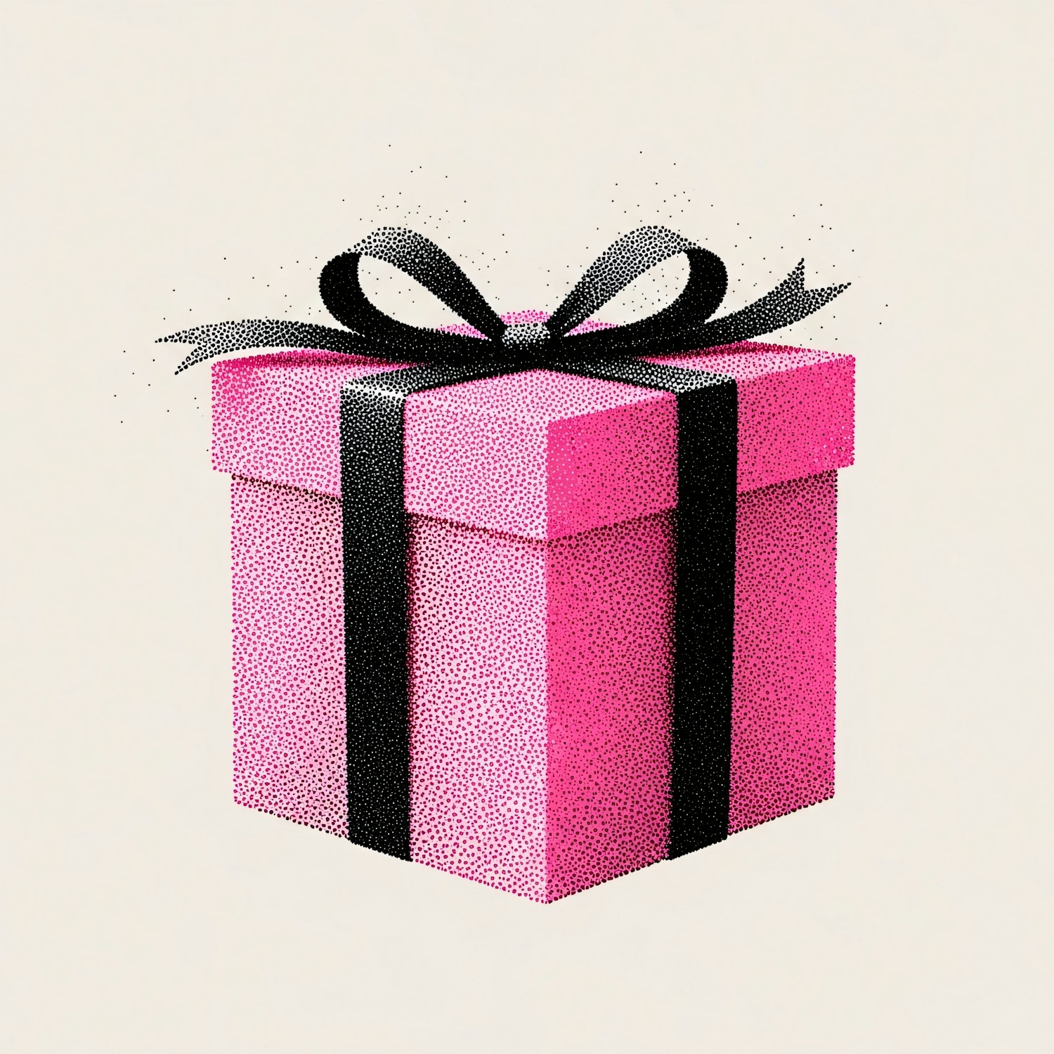 A pink gift box with a black ribbon and bow, illustrated with a stippled texture on a light beige background.