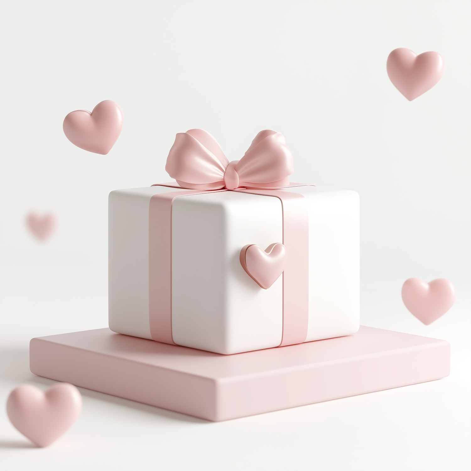 A pastel pink and white gift box with a bow, surrounded by floating hearts, perfect for romantic or celebratory themes.