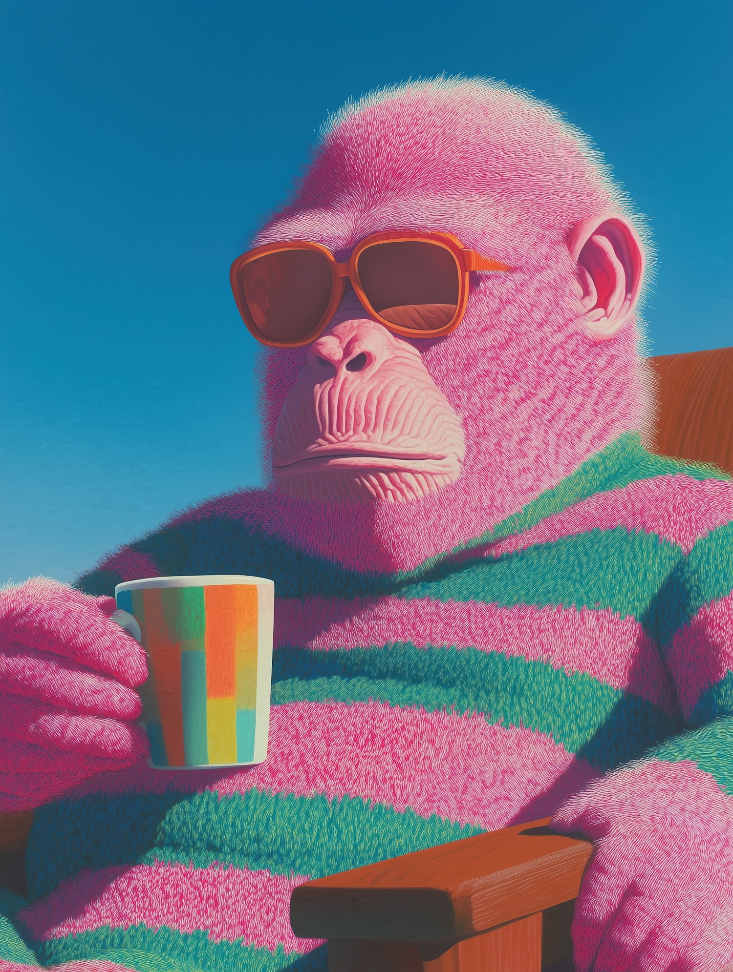 A pink gorilla in sunglasses relaxes with a colorful mug, wearing a striped sweater against a clear blue sky.