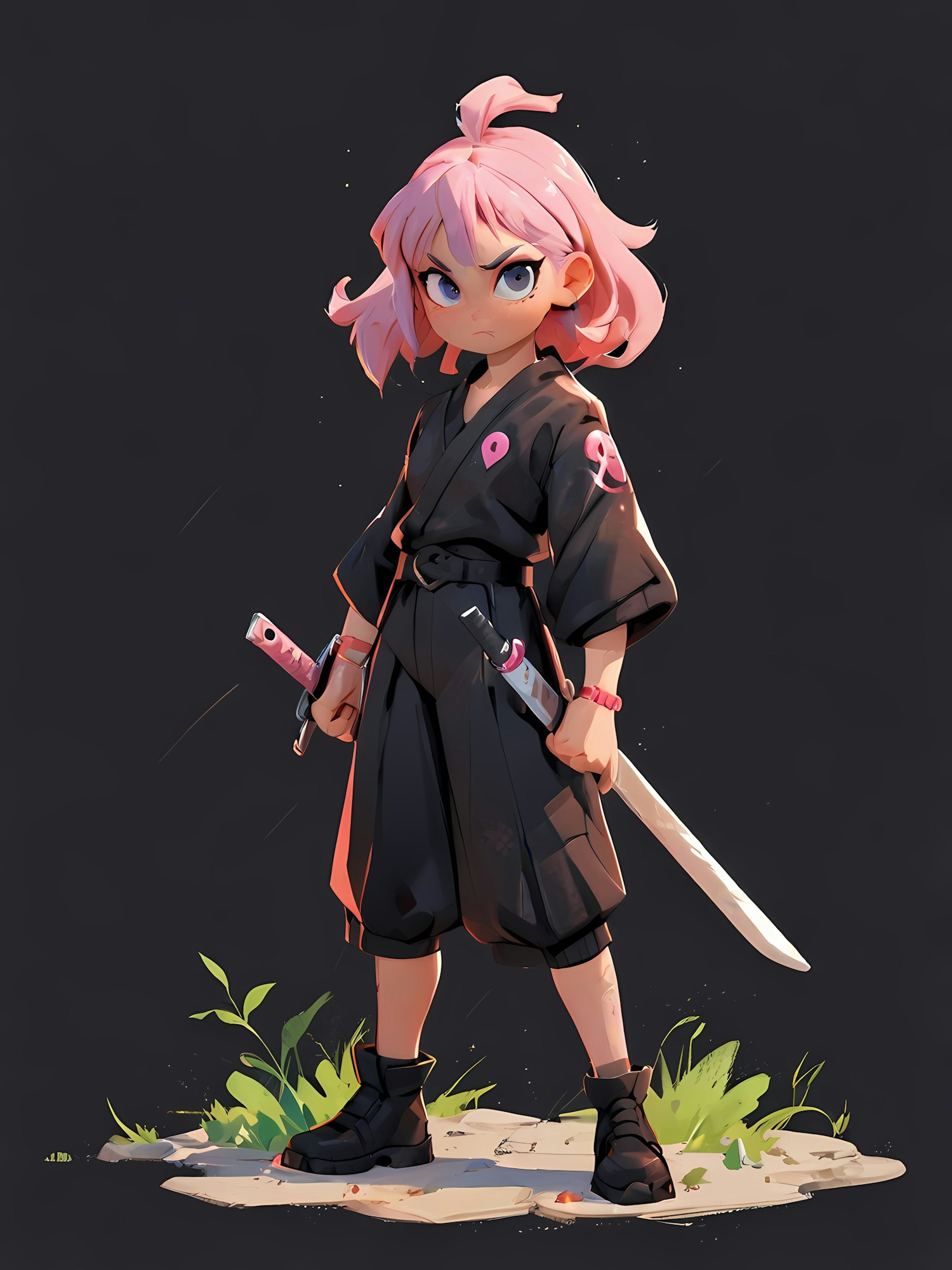 Stylized illustration of a pink-haired girl in a black martial arts outfit, holding a katana with a confident stance on a dark background.