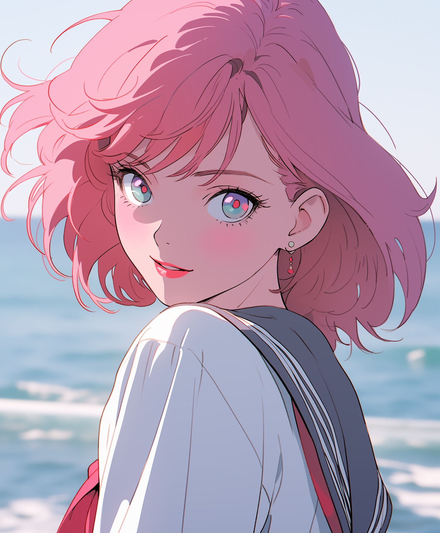 A charming anime-style illustration of a pink-haired girl by the ocean, featuring vibrant colors and a serene atmosphere.