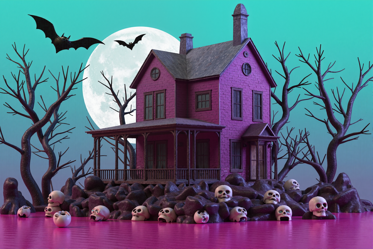 A spooky pink haunted house with bats, skulls, and a full moon, set against a surreal teal and purple gradient sky.