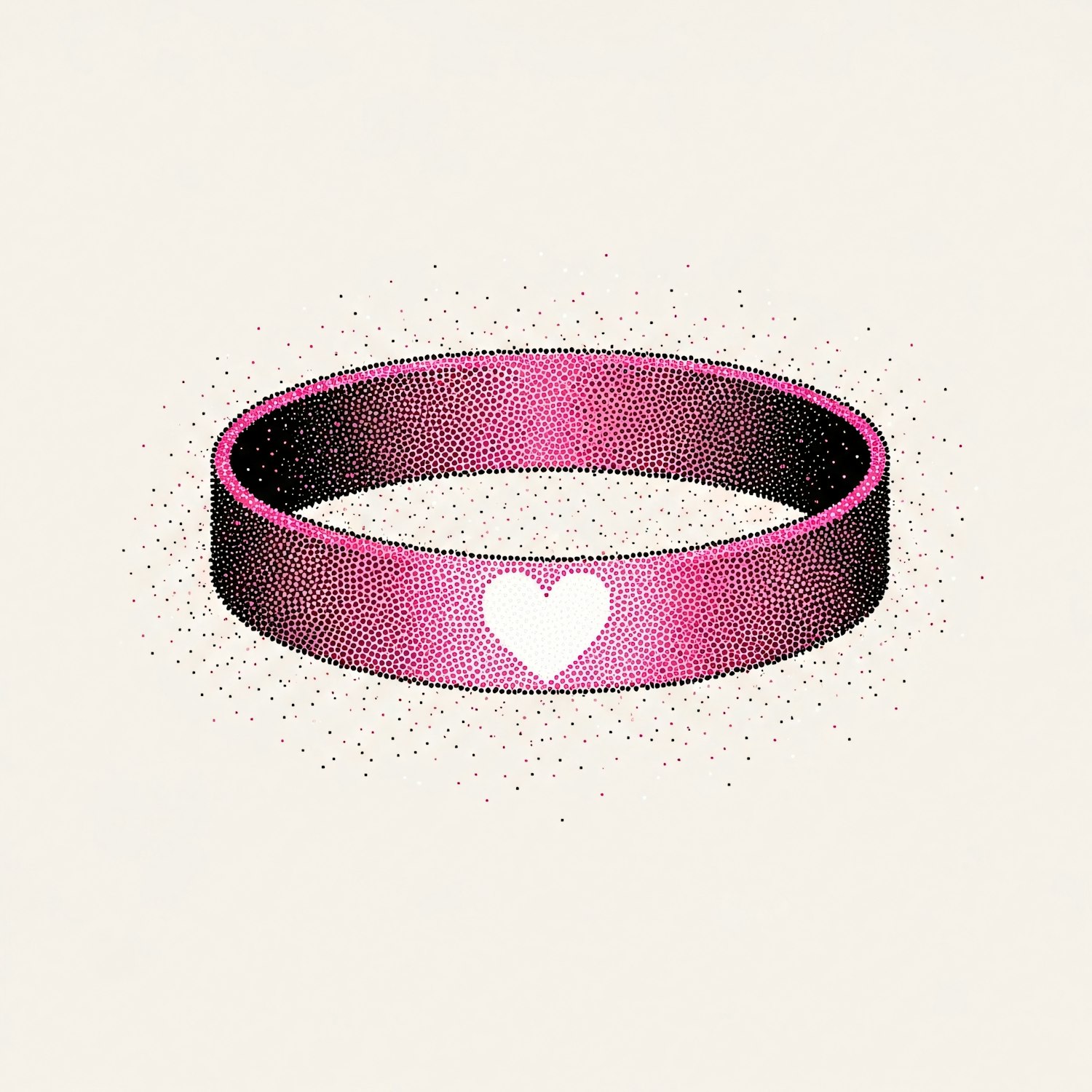 A pink wristband with a white heart, designed in a halftone style on a plain background, creating a retro and minimalist aesthetic.