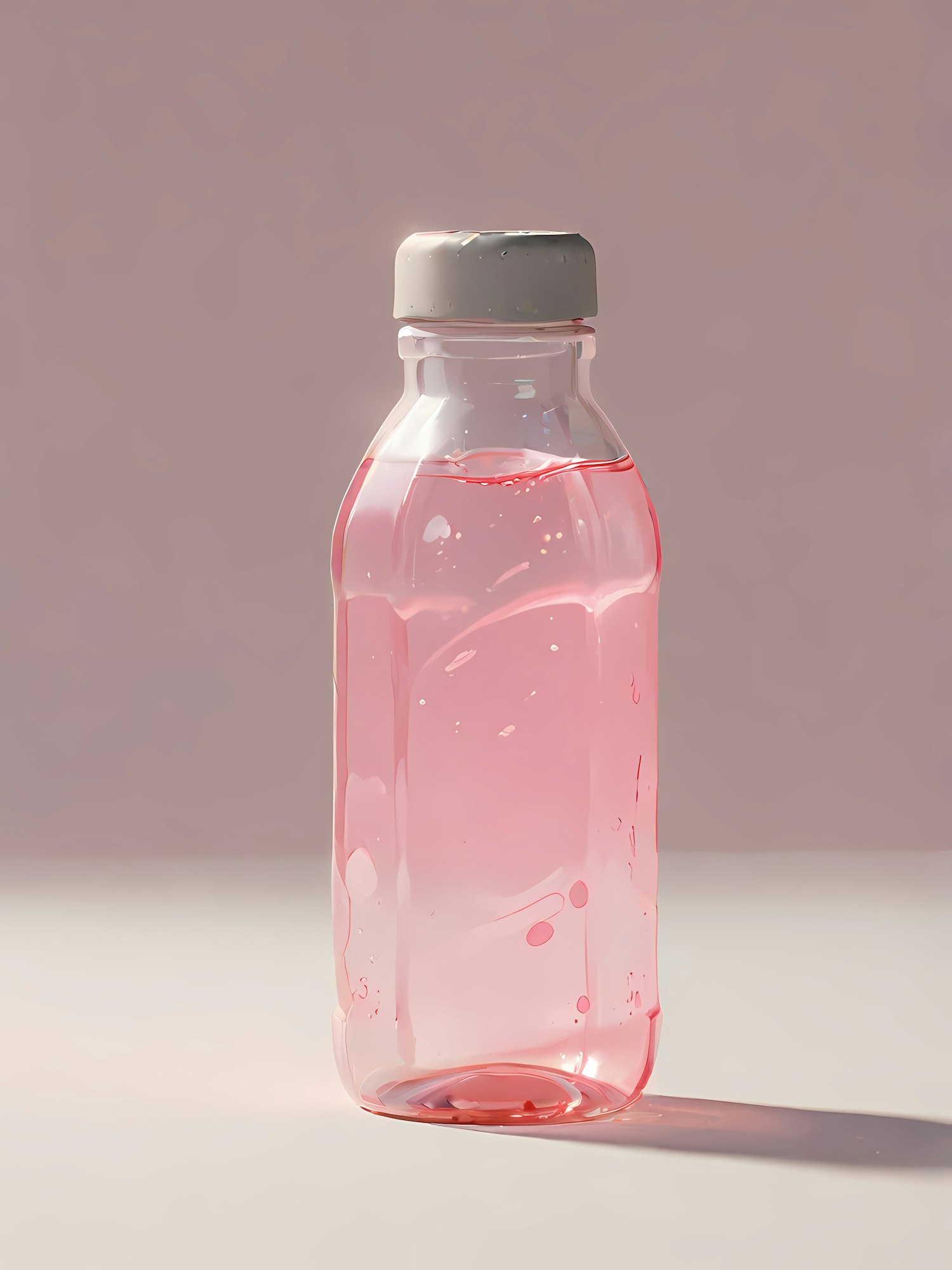 Minimalistic image of a clear plastic bottle with pink liquid and a white cap, set against a neutral beige background.