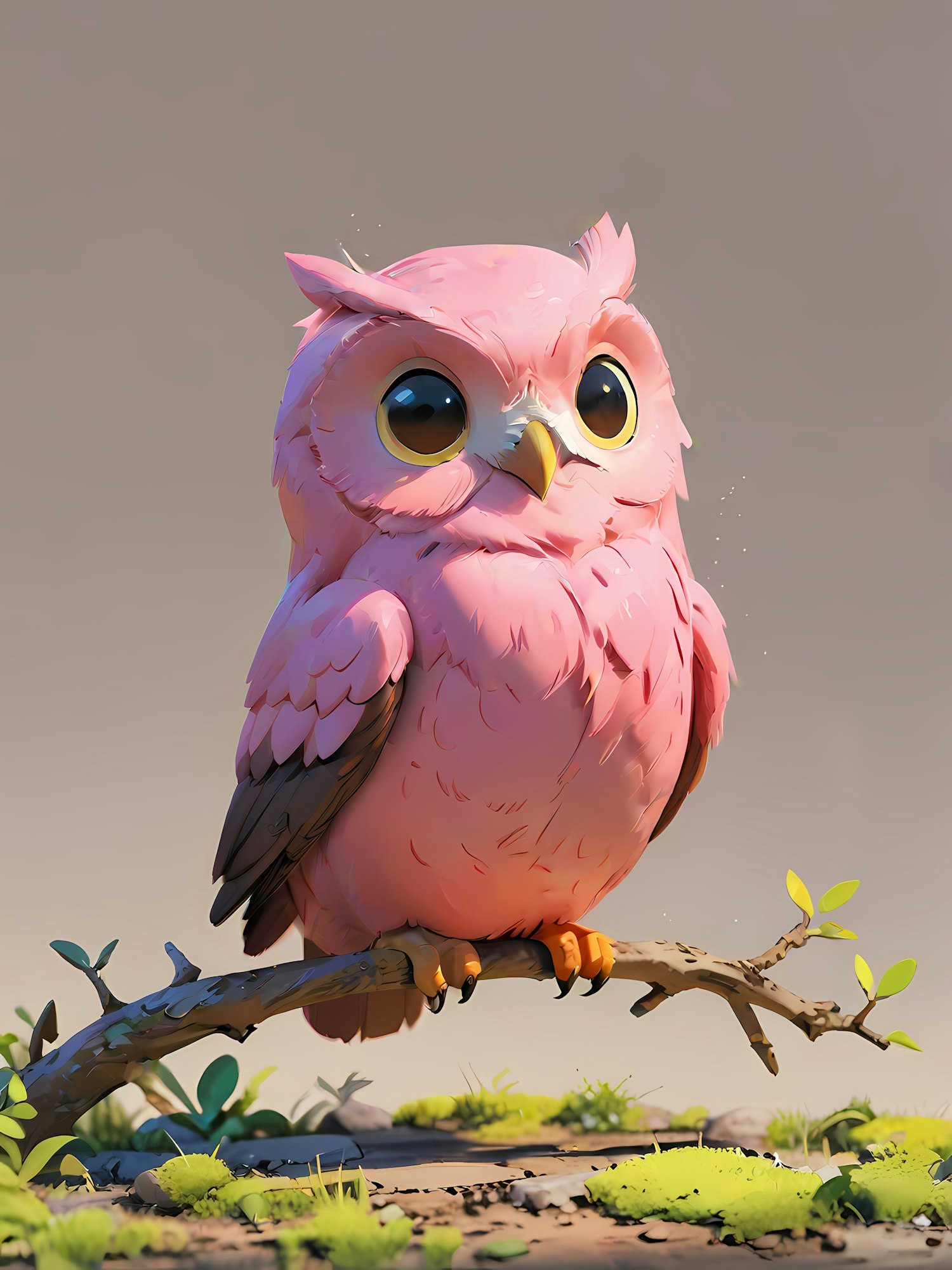 Adorable pink owl with big golden eyes perched on a branch surrounded by moss and plants. Perfect for nature and fantasy lovers!