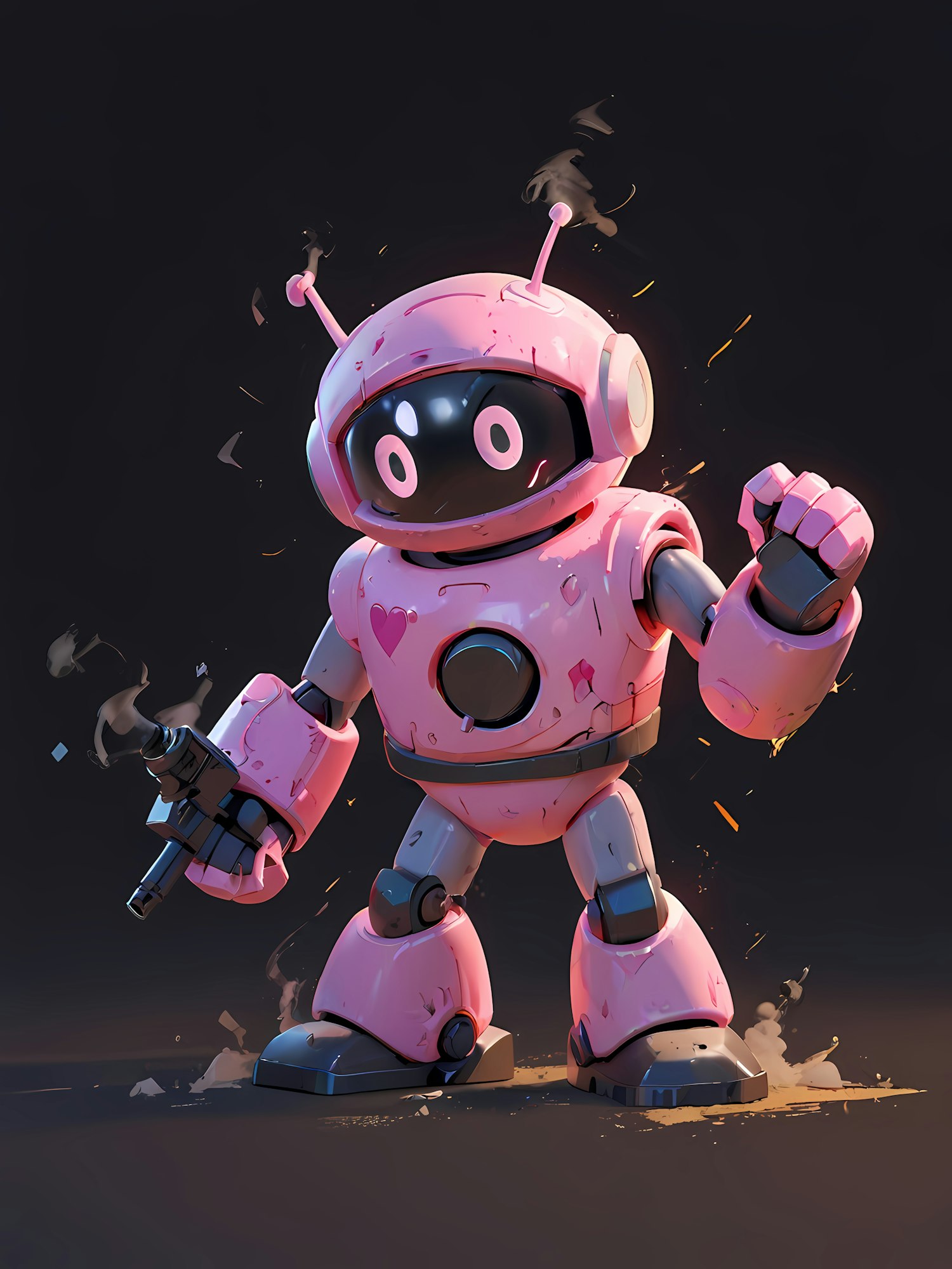 A pink robot with a heart emblem, holding a smoking weapon, stands amidst sparks and debris in a dramatic 3D-rendered scene.