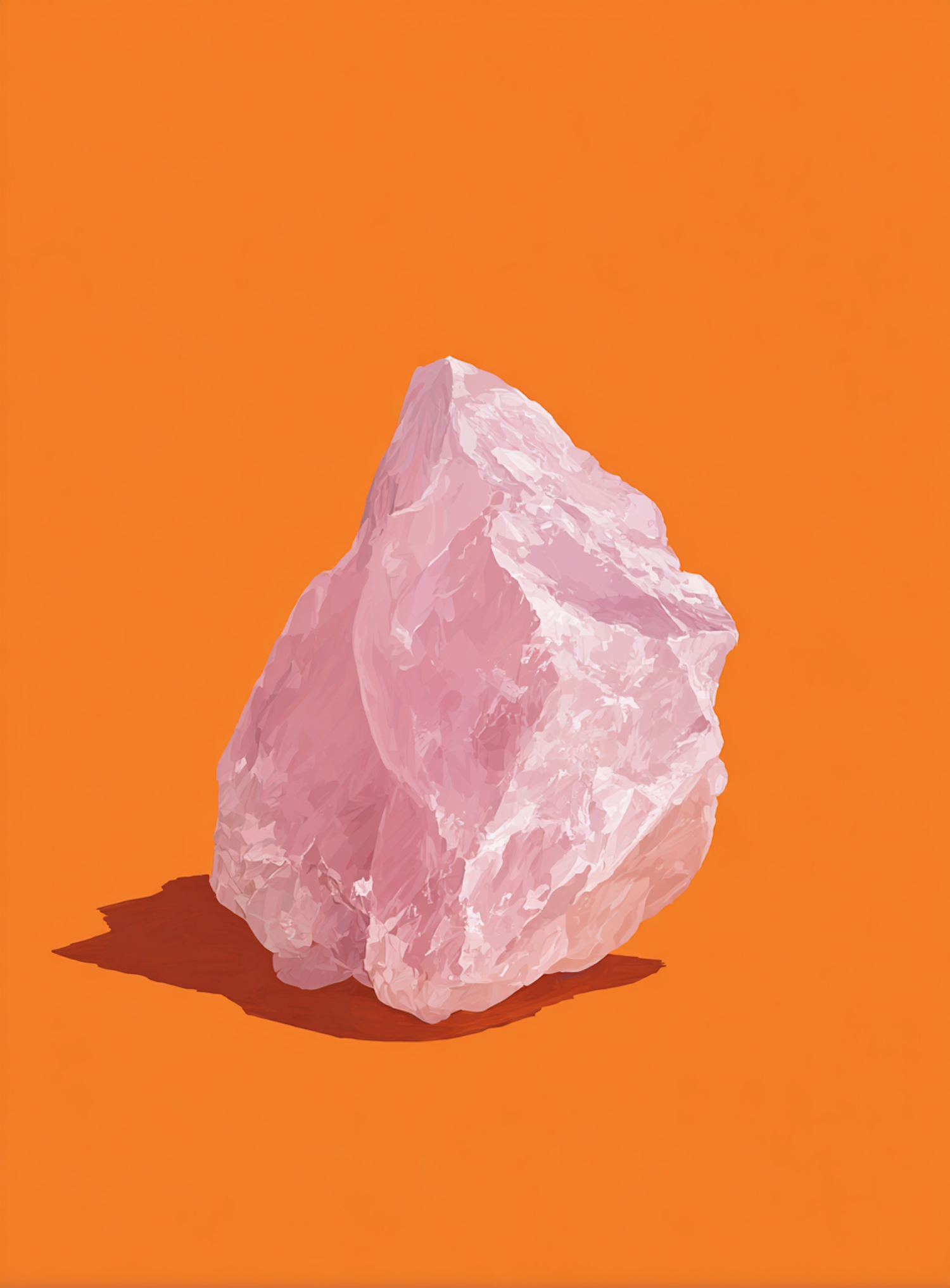 A pink crystal-like rock on a bold orange background, creating a striking and minimalistic visual contrast.