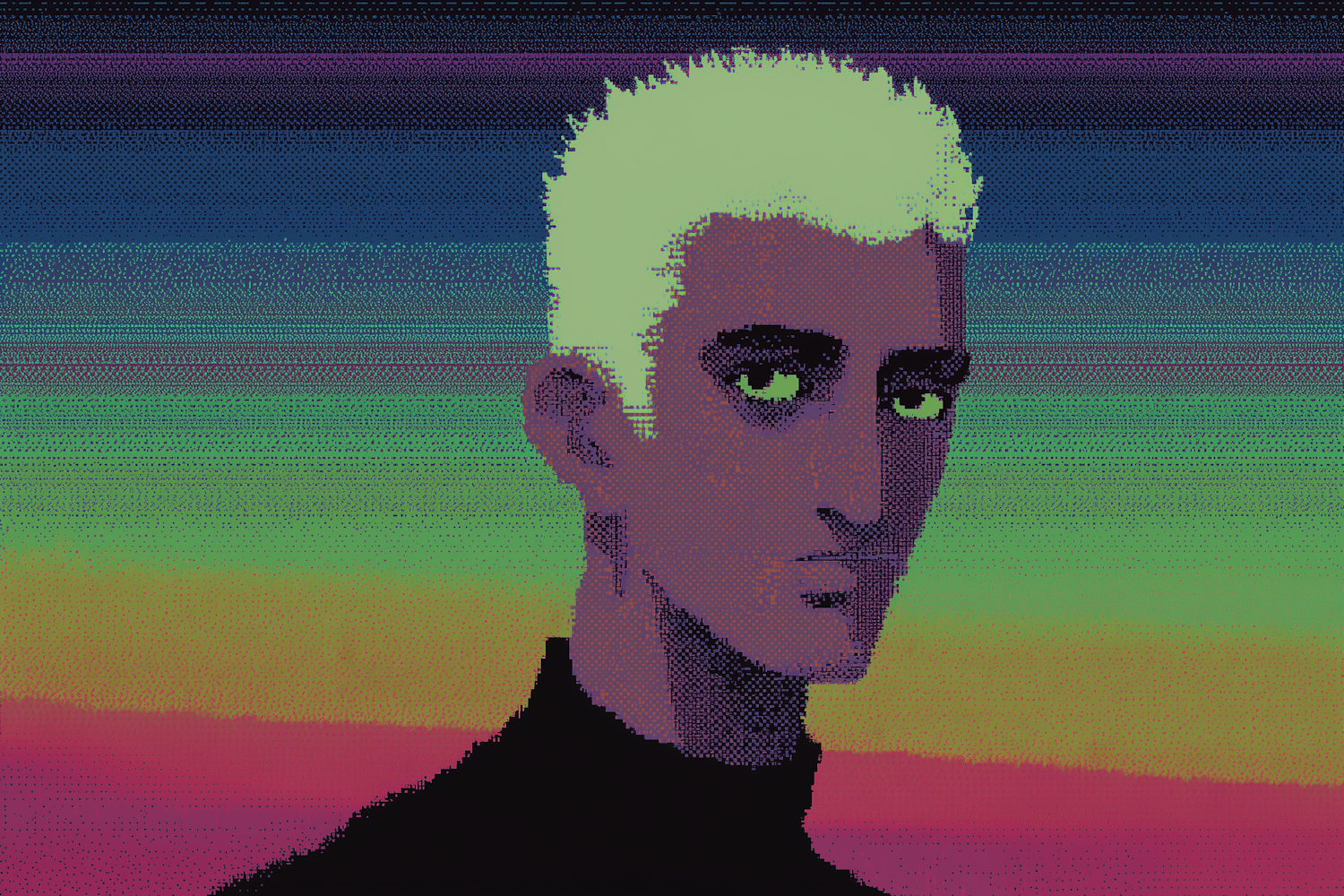 Pixel art portrait of a character against a vibrant gradient glitch pixel background, exuding a retro and artistic digital aesthetic.
